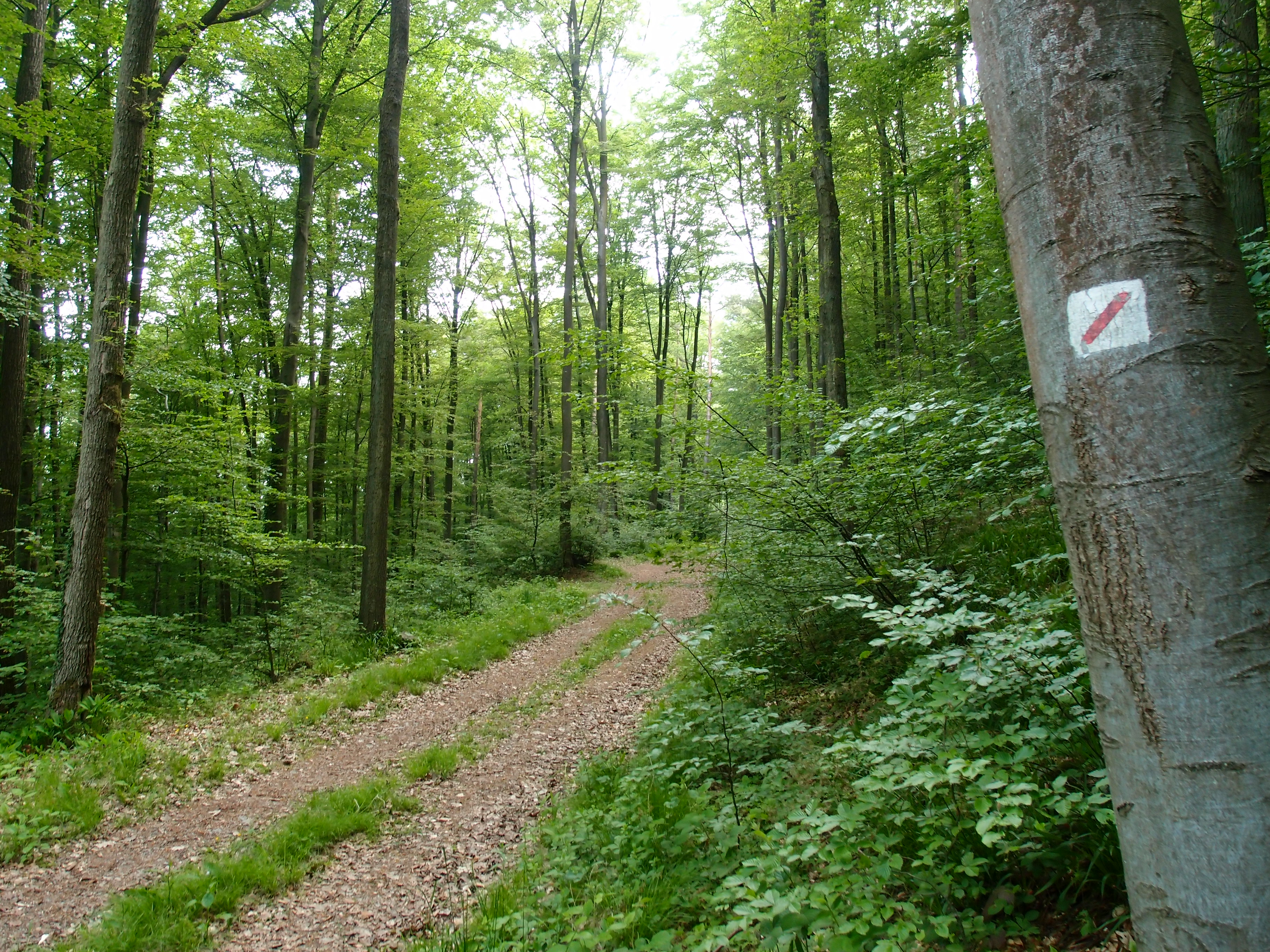 Aber, 1:0 für mich und meine Verwandten: Tatsächlich gab es nur einen Weg, schräg links hoch halt, und der gesuchte Wanderweg war tatsächlich direkt ausgeschildert: Ein örtlicher Wanderweg (weißes Kästchen mit rotem Strich) und – Trommelwirbel – ein R! Ich hoffe mein Opa liest das, denn er hat gleich gesagt, dass der Weg nübber so gekennzeichnet ist, wir waren alle der Meinung, R wäre ein Radweg, der Opa täuscht sich da. Nene, höret auf die Weisheit eurer Ur- und Eltern, Kinder!