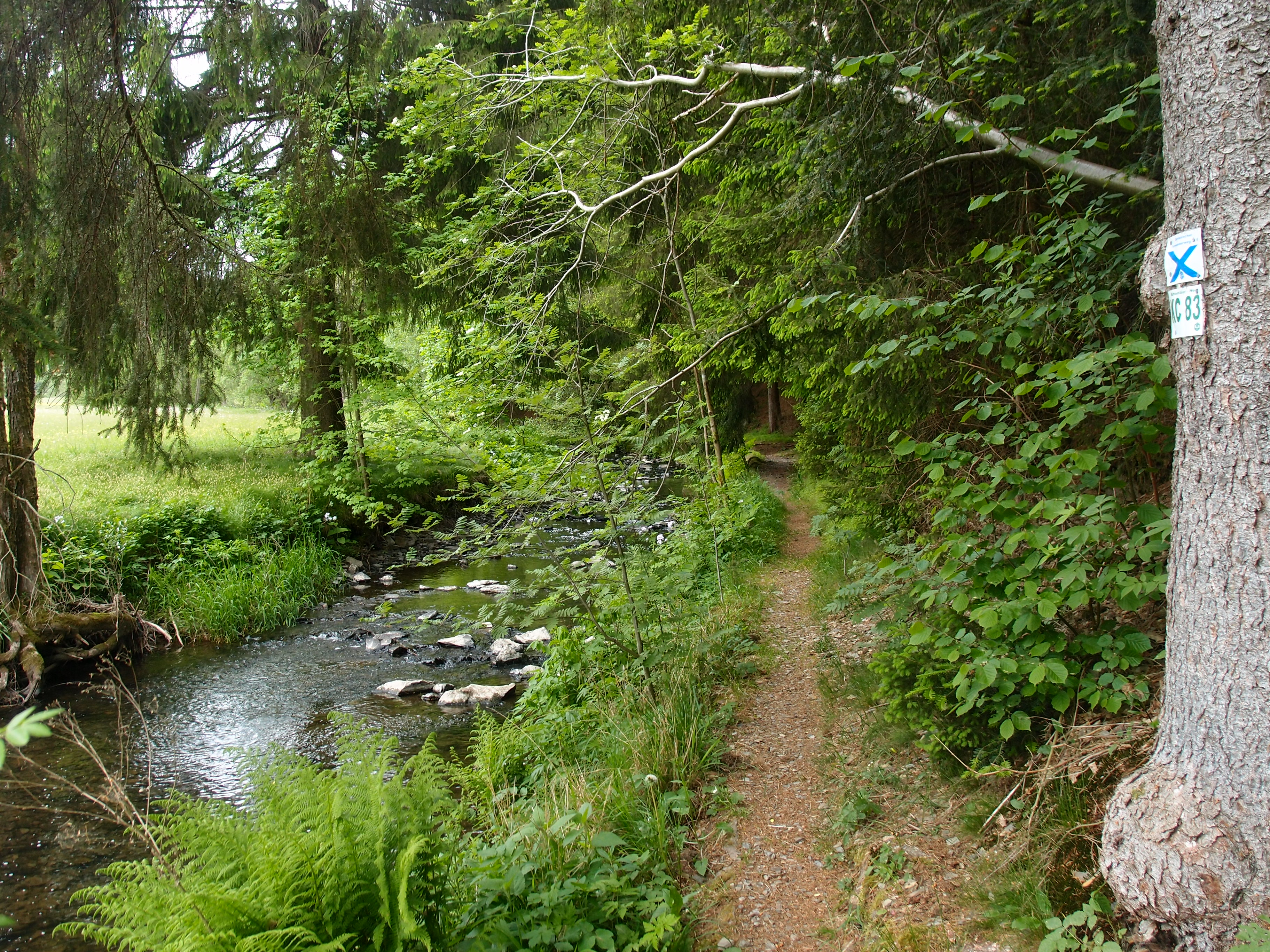 Die Strecke danach ist ein Traum! Ich wähle zwar eine der steilsten Steigungen bisher (kürzer als außen rumzulaufen, manchmal hasse ich mich für diese Entscheidungen…), aber wieder im Wald und es folgen abwechslungsreiche Pfade und Landschaften, bei denen auch die Aussicht auf den Frankenwald lockt. Ziel sollte in etwa die Effelter Mühle sein, wo laut meines Frankenwald-Insiders eine Art Jugendcamp einer christlichen Organisation oder Kirche sei. Vielleicht könne ich dort mein Zelt aufstellen oder auf dem Dachboden der Scheune pennen, wenn ich nett fragen würde. Aber es kommt ja immer anders.