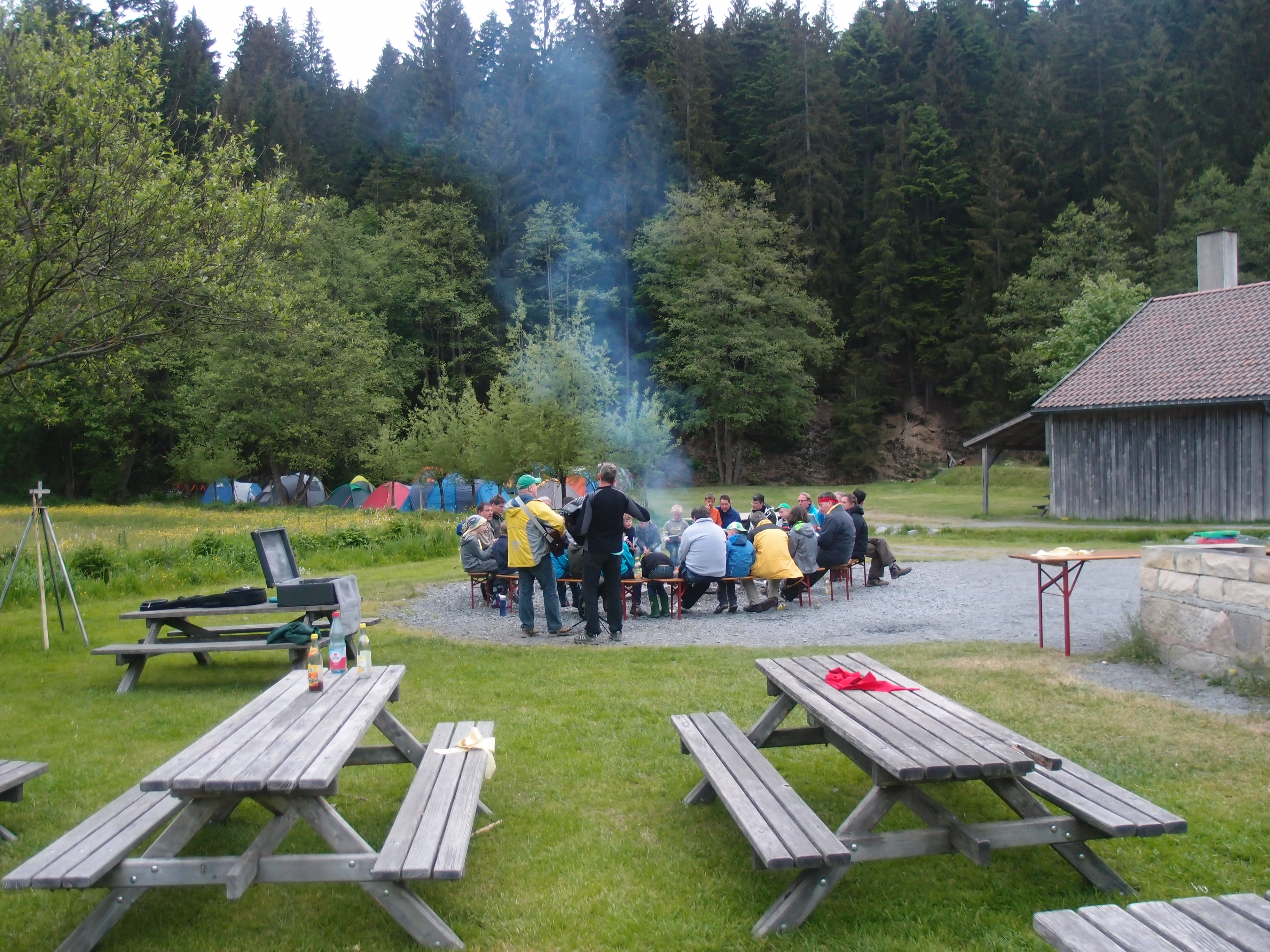 Also runter zu den Holztischgruppen vor dem Zeltlager und sich der Gruppe mal angenähert. Etwas neben mir sitzt ein Mann, der sich später als Gemeindepfarrer von Fürth rausstellen sollte, kaut auf seinem Brot. Ich will ihn dabei erstmal nicht stören und sitze also abwartend daneber. Prompt fragt Rainer, also der Pfarrer, wo ich noch hin will. Joa, ich erklär die Situation, er sagt Moment, geht zu ein paar anderen Männern, kommt wieder und sagt, das Orgateam hätte entschieden, mir entgegen der Freizeitcampregeln die Erlaubnis zu erteilen, mein Zelt auf den Platz neben den Tischgruppen aufzustellen…