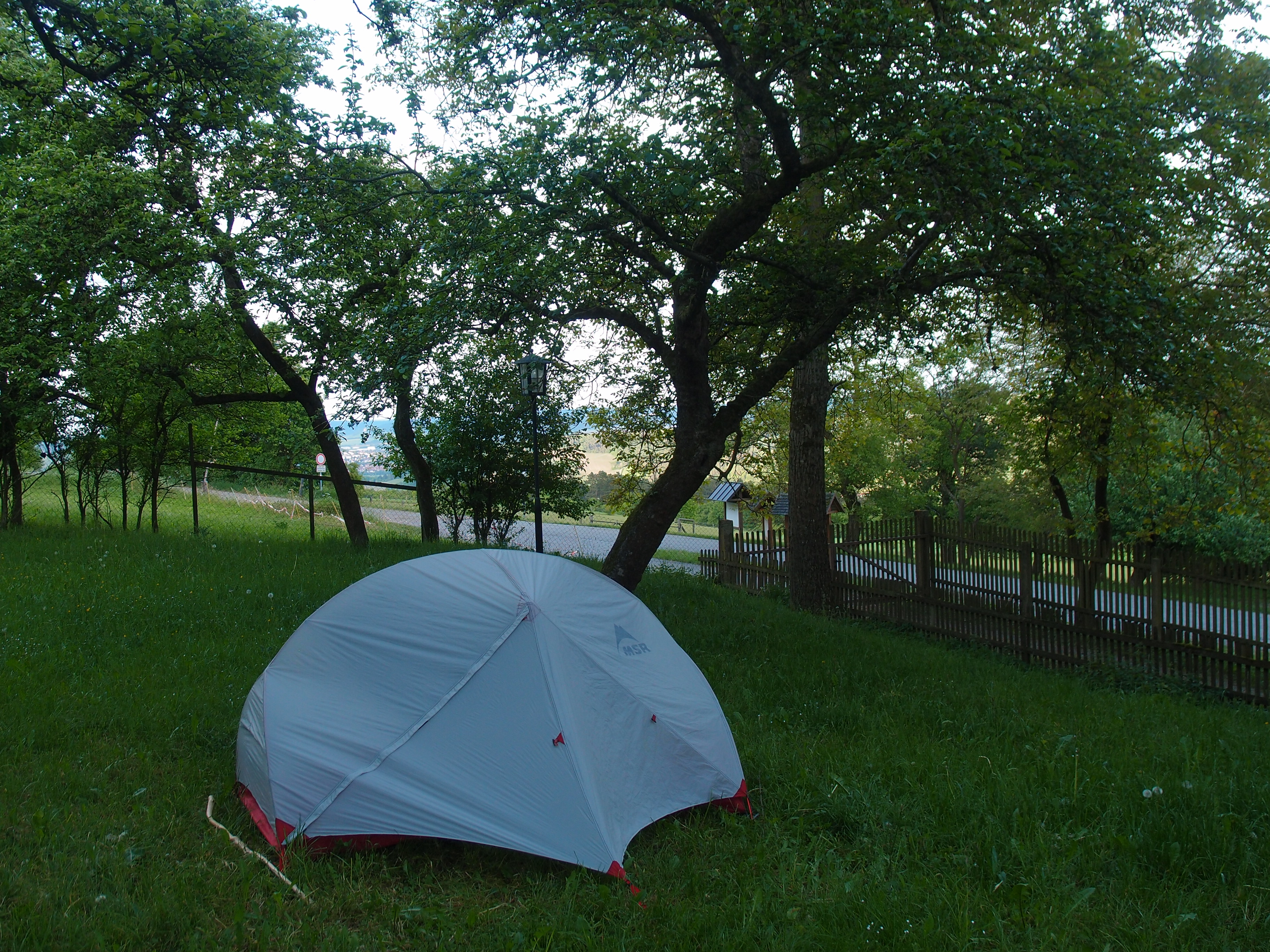 Ich komme also an dem frisch genähten Grundstück an und gehe ans Haus dahinter, denn ich soll besagter Nachbarin ausrichten, dass ich von den Hennings aus dort campen darf. Nach kurzer Überraschung werd ich ins Haus zu Kaffee und Kuchen gebeten… Man kann nie genug Kuchen essen! Ich bin sofort angetan von der quirligen, Energie ausstrahlenden und spritzigen Frau Raupscher, die schon mit 17 per Anhalter Europa bereiste und immer noch begeisterte Weltreisende ist. Also kurz und knapp, wir verstehen uns gut 🙂 Ich schlage das Abendbrotangebot dankbar aus (ich will keine Umstände machen, dazu grad für Pfingsten eingekauft), baue mein Zelt auf und benutze das erste Mal auf dieser Wanderung meinen Gaskocher. Als Frau Raupscher zurück aus der Kirche ist, lässt sie mich noch duschen und fragt sogar, ob sie Wäsche mitwaschen solle. Ach mensch, so viel Nettigkeit. Ihr Mann kam zwischenzeitlich heim und bot direkt die Couch im ausgebauten Keller an – ich wollte aber gerne das Angebot der Hennings wahrnehmen, hatte alles schon fürs Schlafen fertig und wollte die beiden nicht noch weiter belagern.
