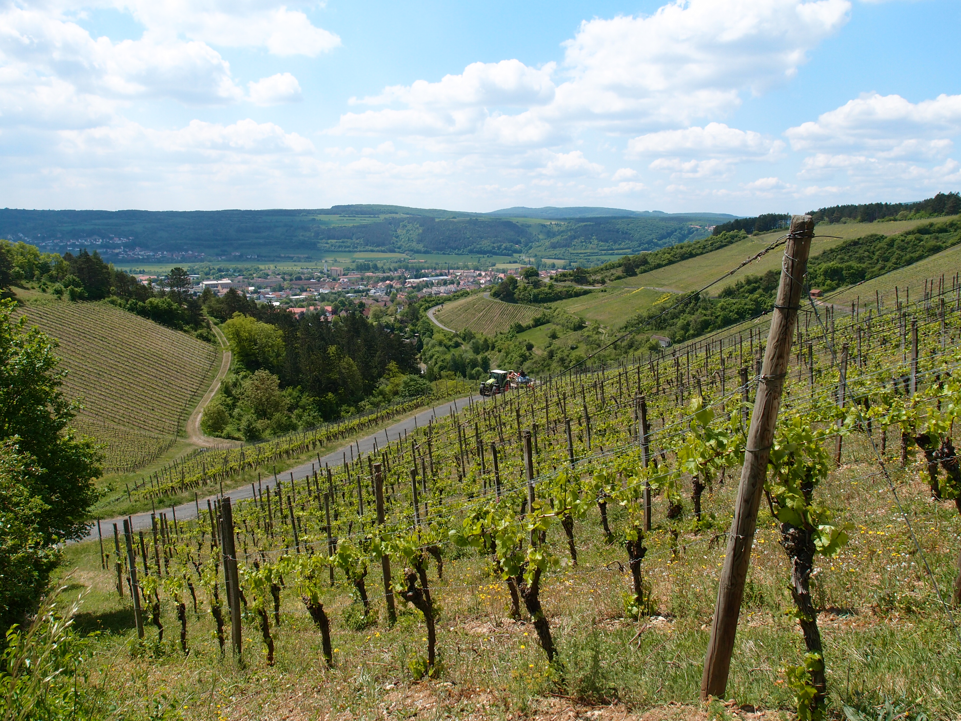 Die nächsten Kilometer aus dem Ort raus ging es bergauf – zack, stand ich in den Weinbergen, wo der gute Frankenwein herkommt (davon habe ich mich einen Tag später selbst überzeugt). Danach ging es herrlich am Bergrand entlang durch ein lichtes Kiefernwäldchen.