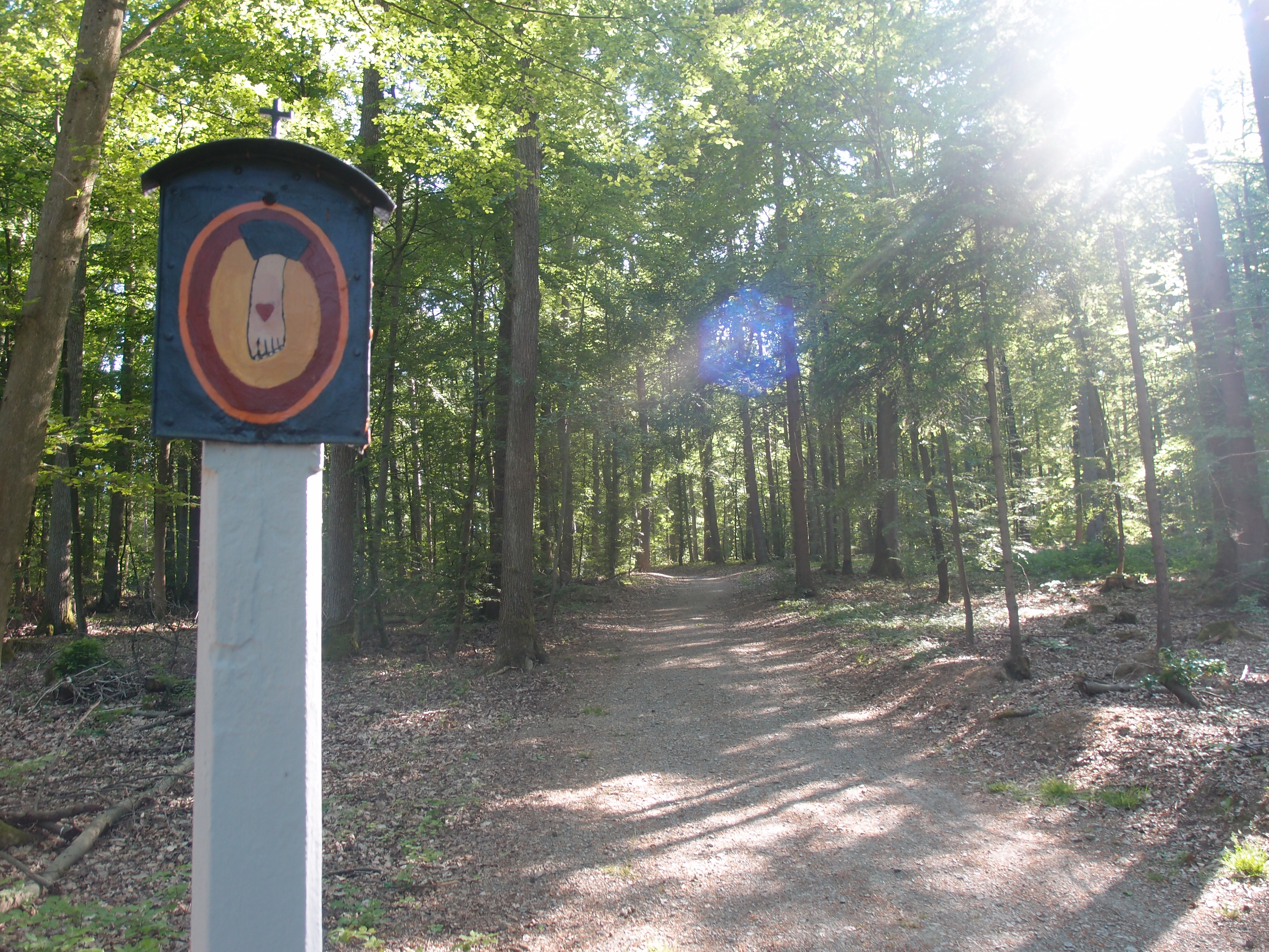 Mit dem Gedanken lief ich daher ziemlich entspannt auf dem E3, der nach den ersten schönen Wald- und Wiesenabschnitten leider wieder mit Forstwegen durch Feld glänzte und sich von Kaff zu Kaff, ähm tschuldigt, von Ort zu Ort schlängelte. Also Asphalt oder kiesig staubige Erdböden, kann ich ja leiden, aber wie gesagt: Wer an einen entspannten Tag denkt, läuft auch noch bei der Feststellung entspannt, eine Abzweigung verpasst zu haben. Noch immer in Sonnenschein laufe ich 500 Meter zurück, laufe dann (da ich ja Karten lesen kann) quer durch ein paar Felder und komme so weiter vorne zurück auf den E3. Kein Problem 😉