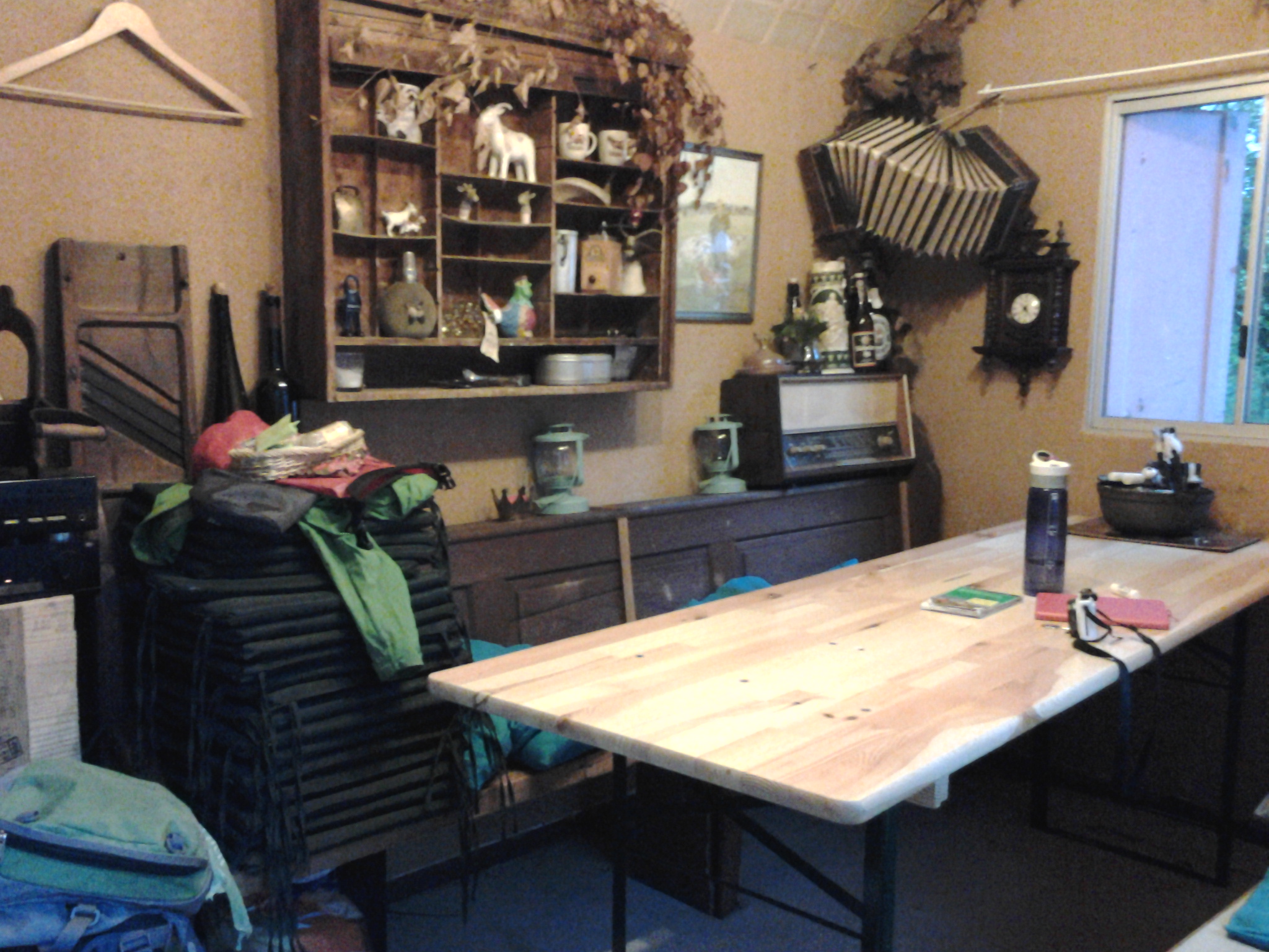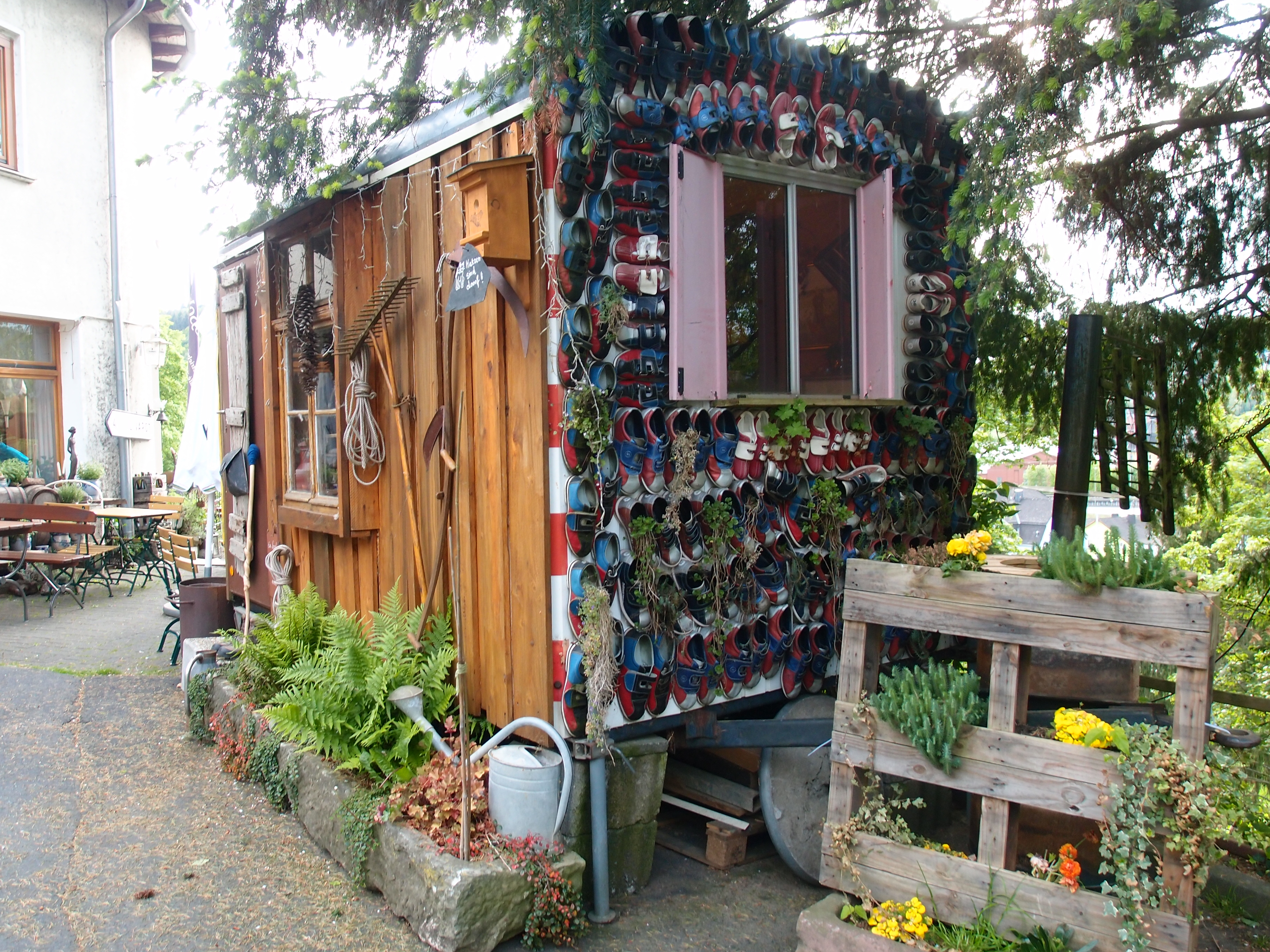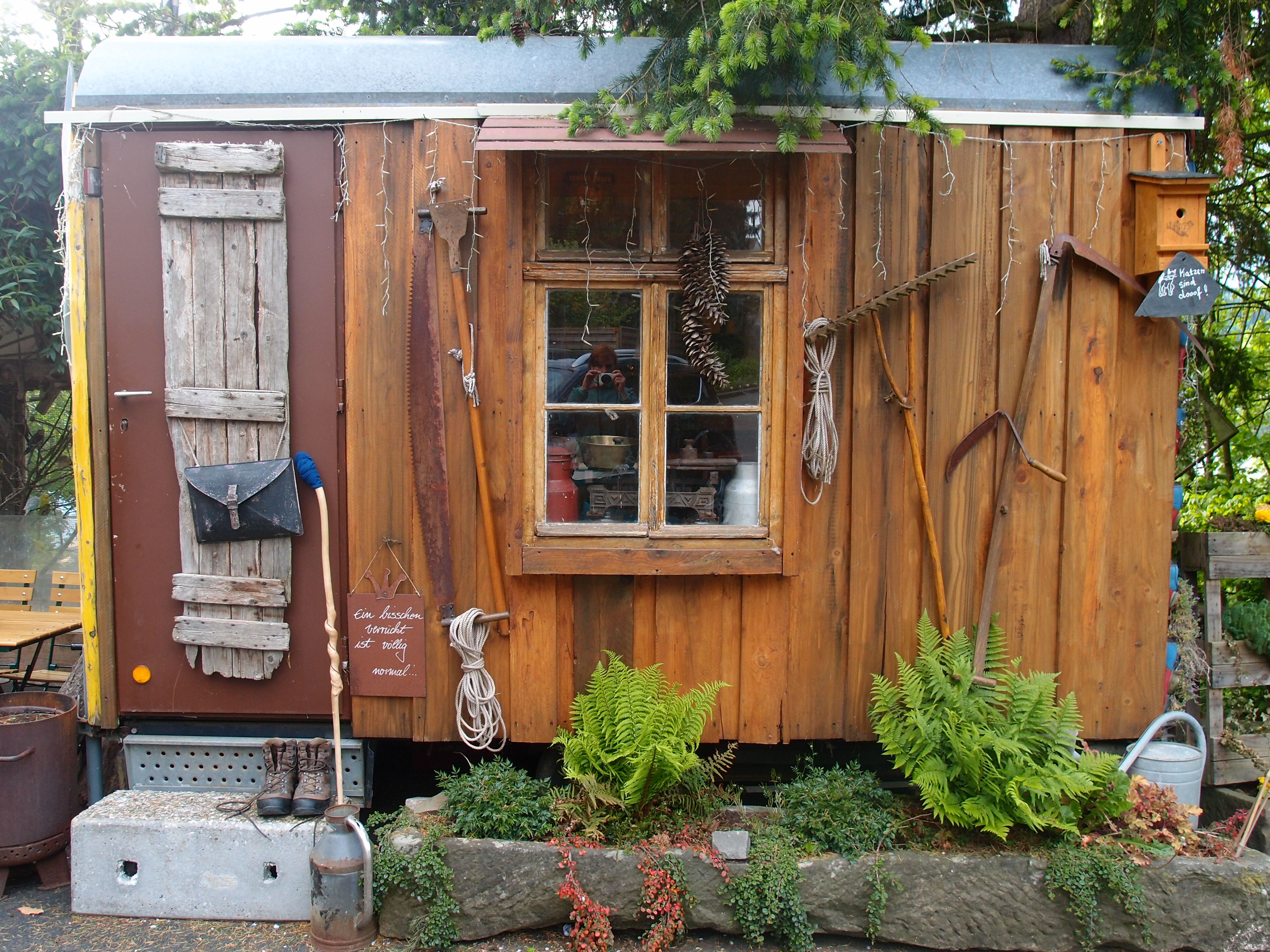 Klingt, als müsste ich da auf jeden Fall hin! Der Bauch (oder Magen) trifft einfach gute Entscheidungen 🙂 Wenig später bin ich da, gehe ins Café und bin vom ersten Moment an verzaubert – so viele schöne,  alte, ungewöhnliche Dinge schmücken den Raum! Gut, ich werde von den meisten Kaffeegästen komisch, oder sagen wir, verwirrt angeschaut: Ich pass grad so rein mit meinem Rucksack, doch der Chef begrüßt mich gleich sympathisch mit „Landstreicher lassen wir hier nicht rein“! Er bringt mir dann meinen ersten Kuchen und fragt dabei, wo ich noch hin will. Ich erzähle von der Idee mit dem Waldhaus, er sagt: Da draußen ist auch ein Bauwagen wenn du willst.“