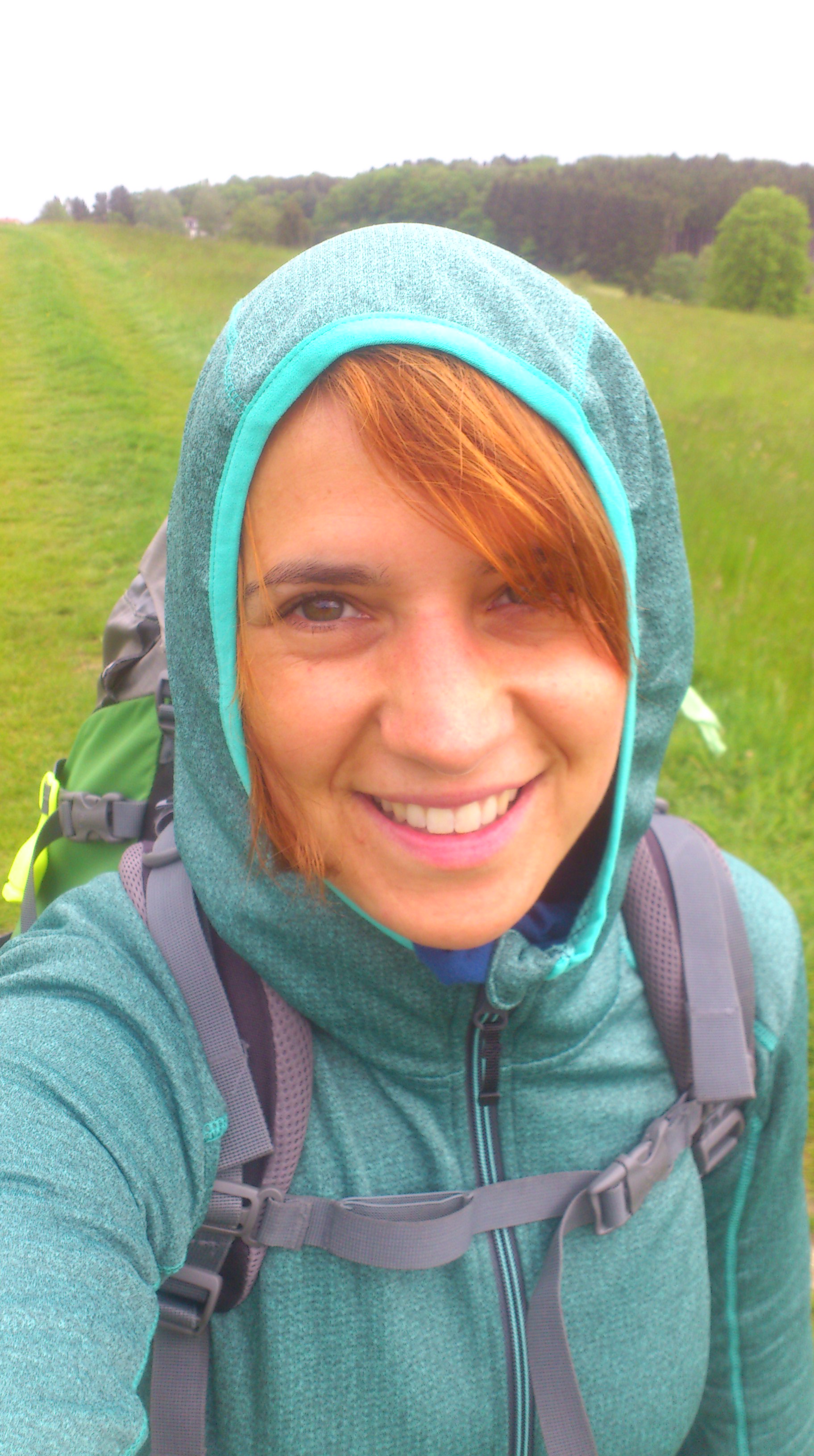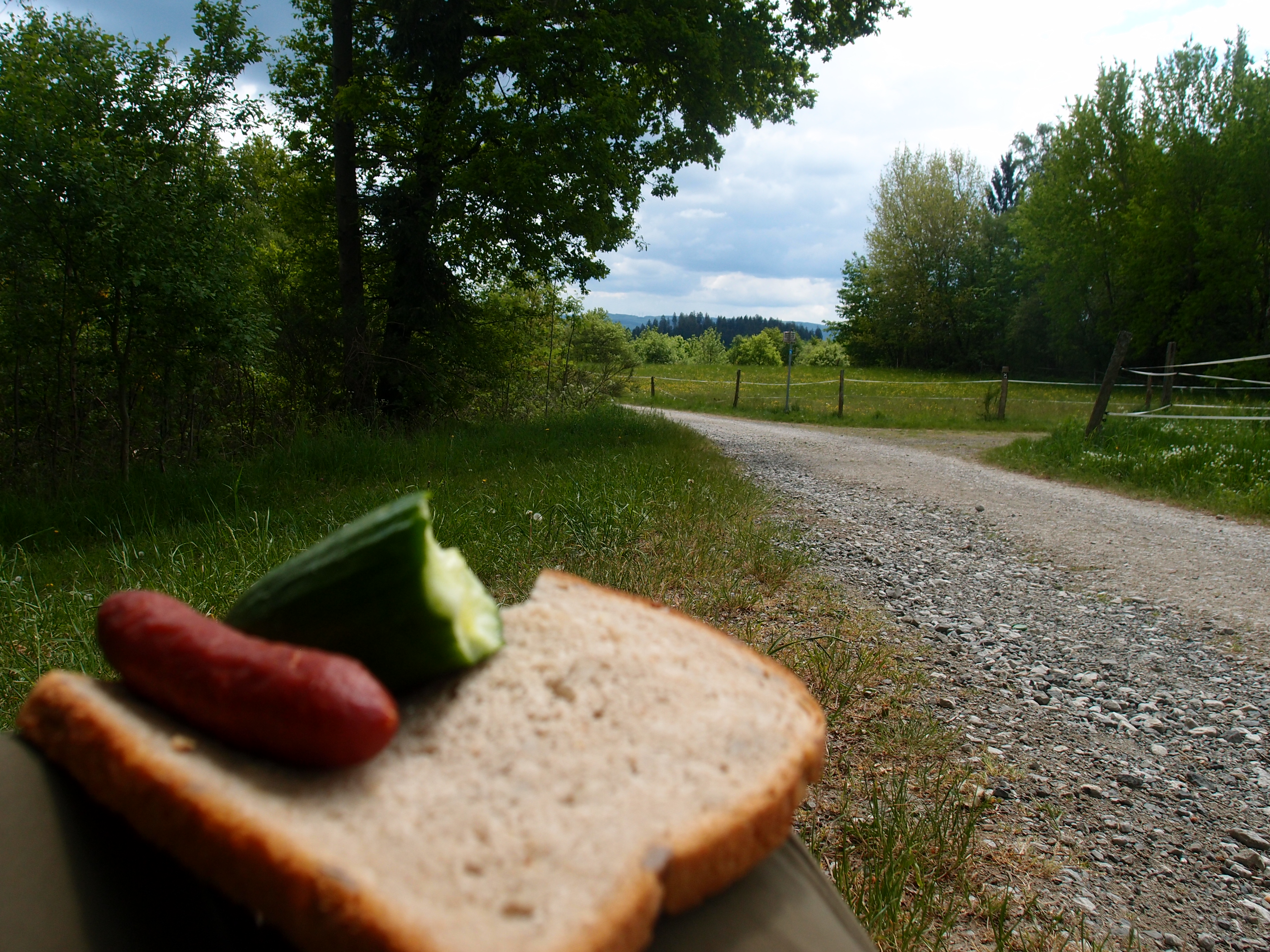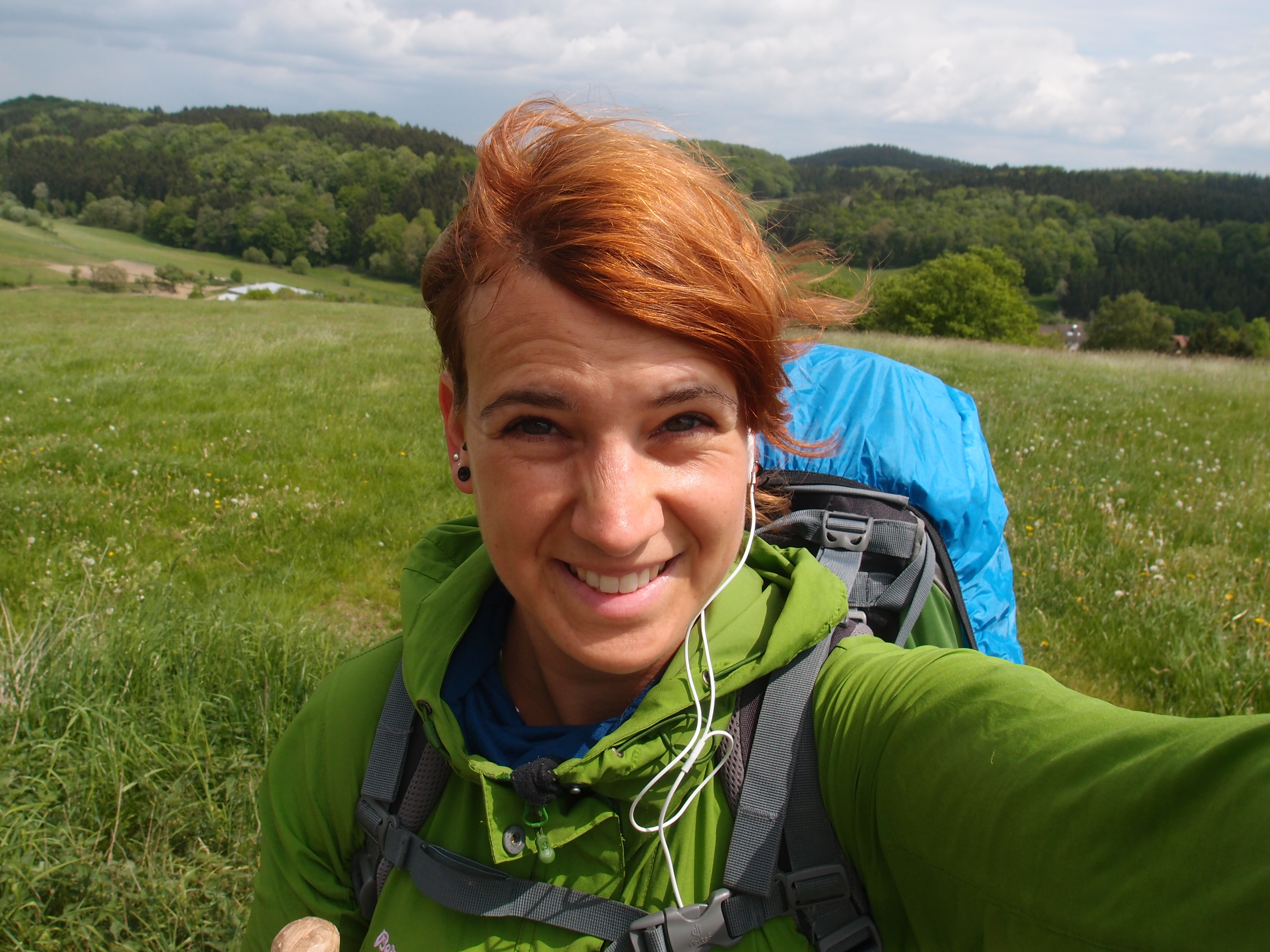 Die ersten 4 Kilometer also gemeistert (statt 7 oder 8 drumherum und bergauf), jetzt folge ich wieder dem X11, der mich erstmal ne ganze Weile auf den Verbindungsstraßen zwischen den kleinen Ortschaften auf den Hügeln entlang schickt. Nicht atemberaubend, dafür umso unaufgeregter: Nach etwa 8 Kilometern bleib ich plötzlich kurz stehen und sehe mich um: Um mich rum nur Felder, Wiesen und Wälder,  kein Auto, kein Haus, nur dieser Feldweg und ich. Musste ich doch tatsächlich kurz innehalten, um zu realisieren, dass ich grade genau hier bin. Hab ich mich wirklich ein bisschen in Trance gelaufen 🙂
