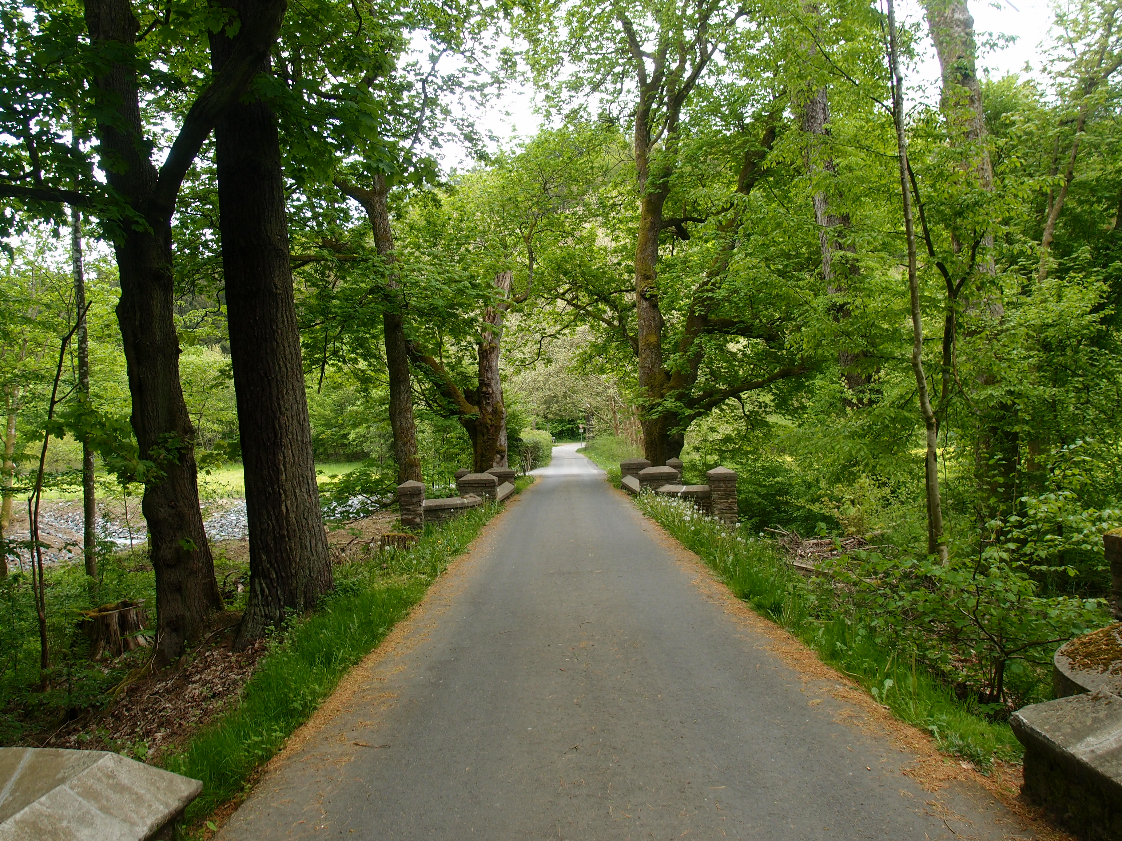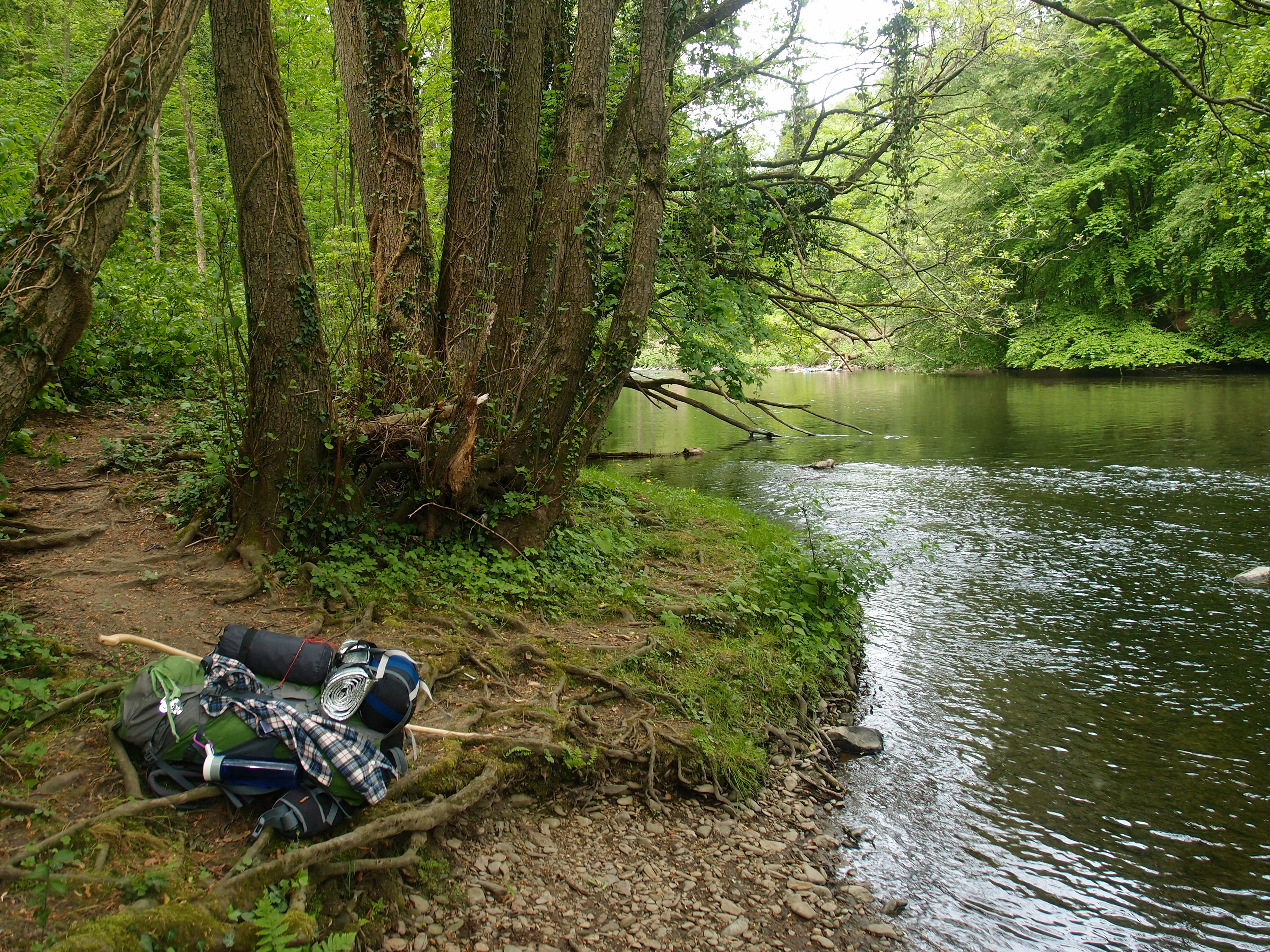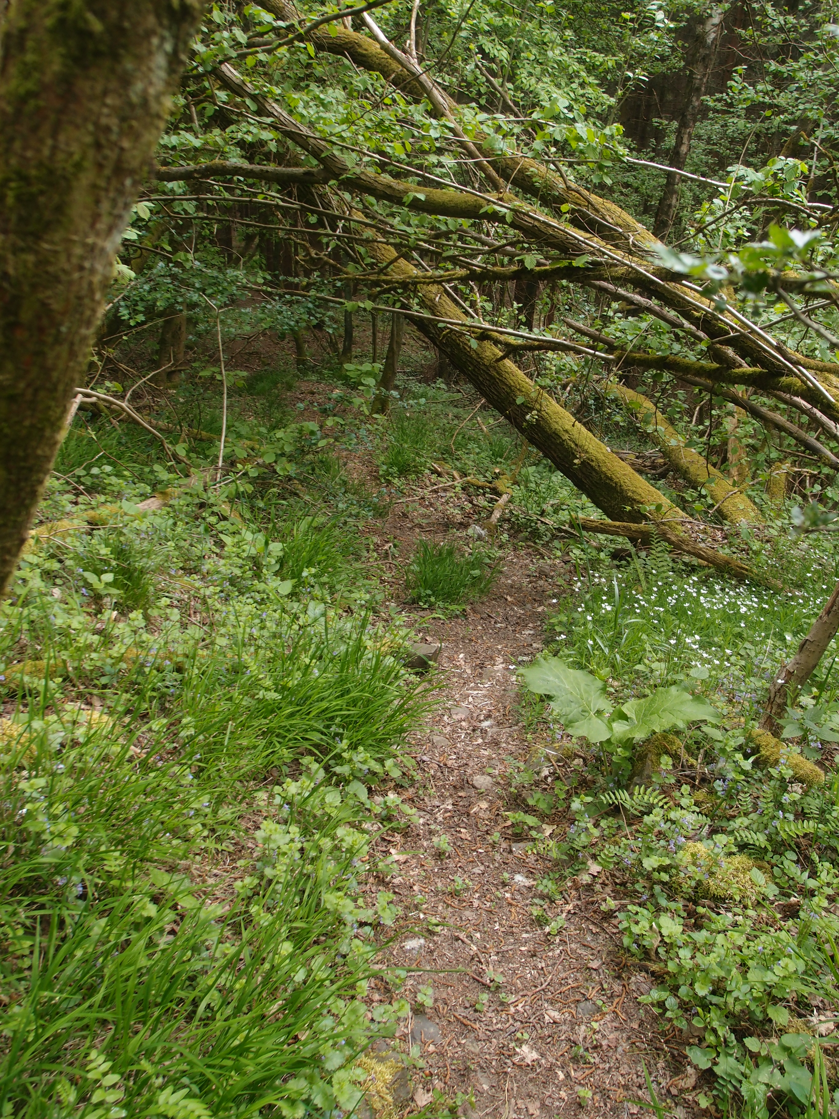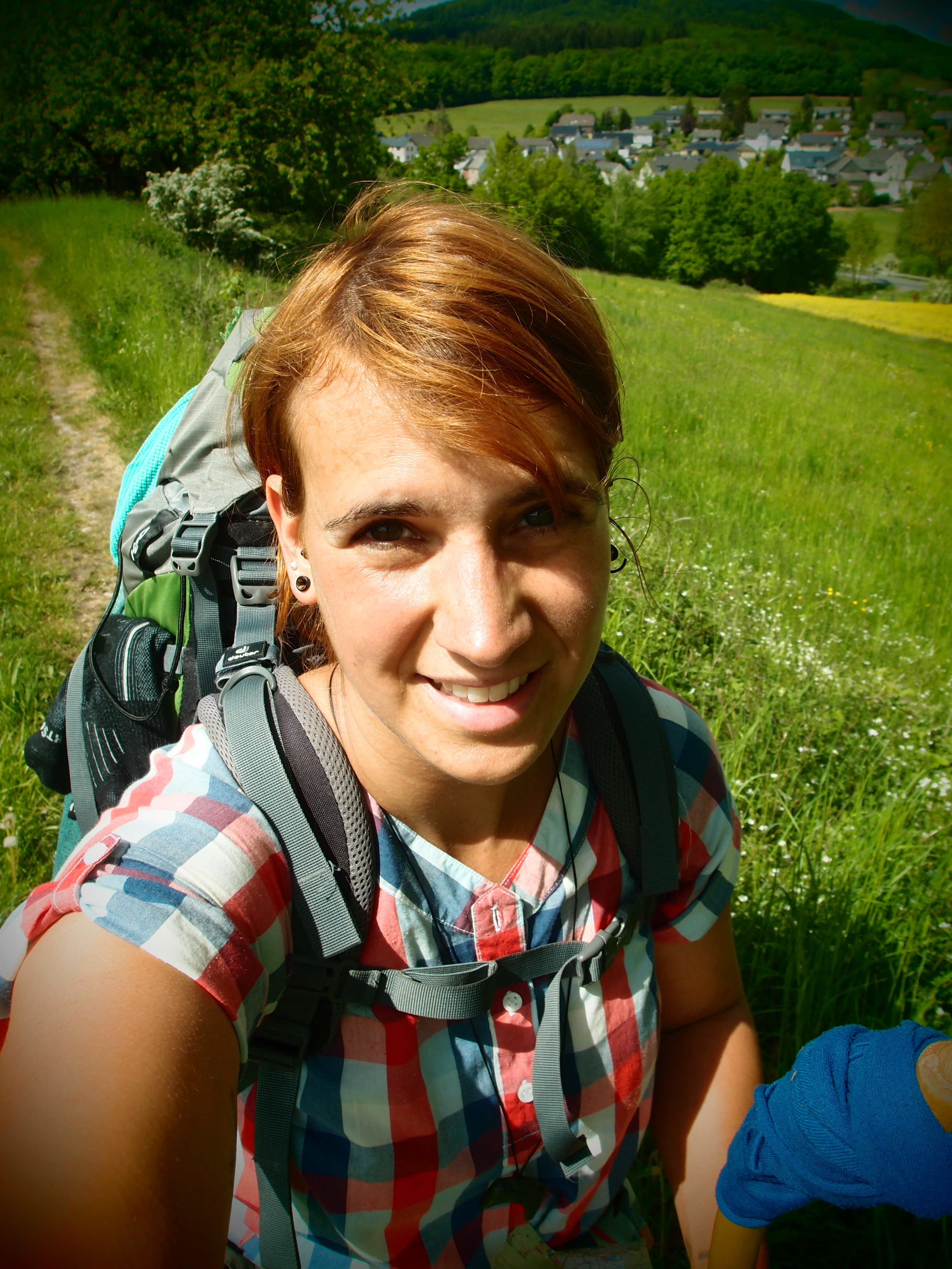 Weiter gings, und dieser Abschnitt steht unter dem Motto: Scheiß auf Eitelkeit und dreh gefälligst um! Onwohl, eigentlich war es ganz lustig 😉 Ich stellte nämlich 2 Minuten nach der Rausmühle fest, dass ich den falschen Weg gewählt hatte. Wollte aber nicht zurück und nochmal am Gasthof vorbeigehen, weil ist ja peinlich, wo ich grad noch mit zwei Gästen über das Gewicht meines Rucksacks und in etwa sowas wie  “ ja ja, ich such mir da meinen Weg schon, so zwei, drei Wochen,  ja ja, das passt schon“ geredet habe. Also, die eitle Hanna liest die Karte, findet 100 Meter weiter oben einen Waldweg,  der etwas weiter wiederum auf den eigentlichen Wanderweg stößt. Perfekt, eigentlich. Doch der Waldweg wird schmaler,  führt dann runter zu einem Fluss und dann nichts. Links Wasser, rechts ein sehr schräger Waldhang. Zu steil?  Ach was soll’s, weit vorgelehnt, um gegen das Gewicht des Rucksacks zu arbeiten, und mit Stock-, Hand- und Knieeinsatz kraxel ich da hoch und kämpf mich noch ein kleines Stück durch den Wald. Wer umdreht, verliert 😉