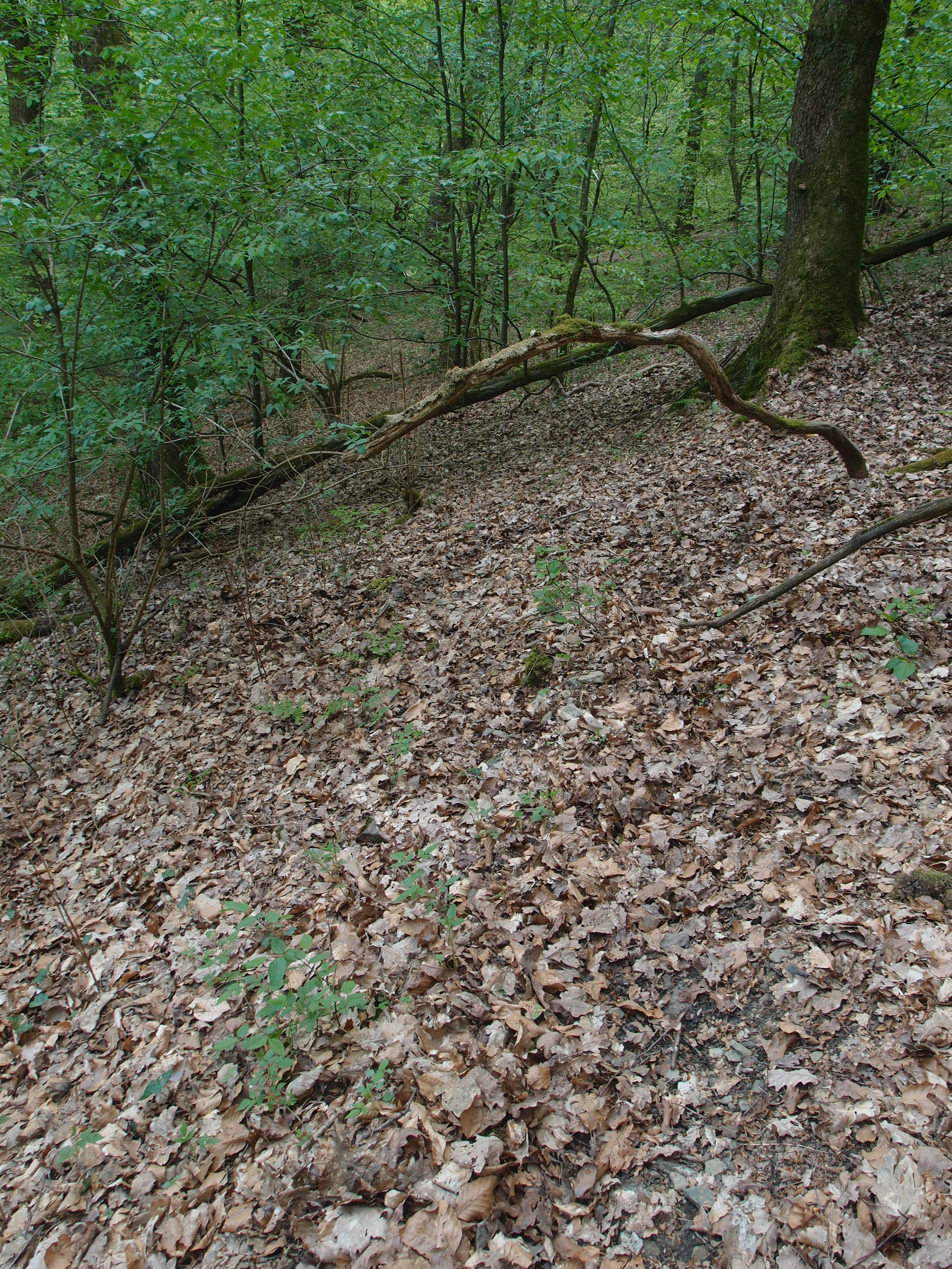 Hier gestaltete sich das Orientieren anhand der Karte schon schwieriger, ich versuchte es mit Himmelsrichtung und einer Straße in der Ferne. Tja, ich kam auch zurück auf einen Weg, der zur Straße führte – aber oberhalb, der Hang zu steil und von dicht stehenden Bäumen und Büschen verdeckt. Also irgendwie drumherum, dann an der Straße lang. Es war richtig warm geworden und ich war ziemlich ko.