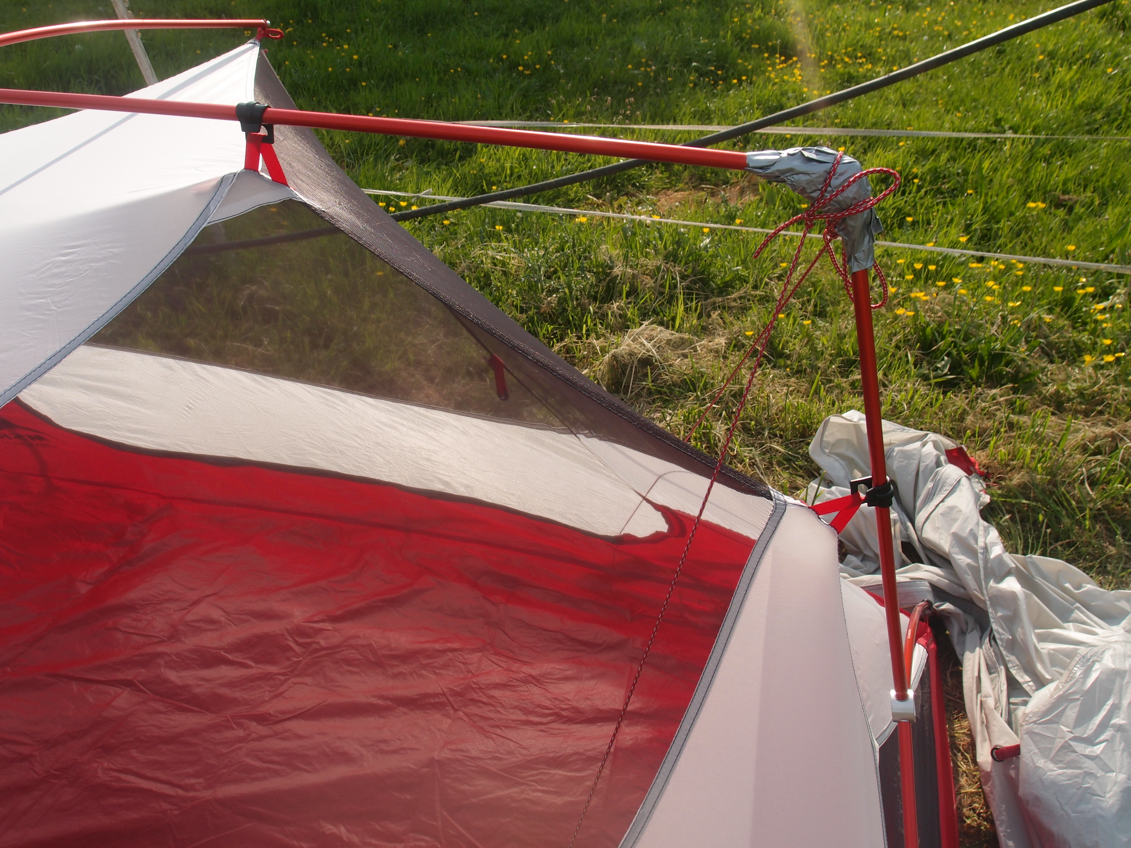 Böse Überraschung: Die Verbindung zwischen zwei Zeltstangen ist gebrochen! 😦 Da die Stangen in einem System zusammenhängen, kann man sie leider auch nicht ad hoc reparieren oder rausnehmen. Kurz sehe ich meine ganze Tour den Bach runter gehen. Dann meldet sich der MacGiver in mir: Panzertape. Ich gehe hoch zur Hofbesitzerin Barbara, die hilft mir sofort aus und schenkt mir liebenswerter Weise die Rolle. Ich muss leider feststellen, dass die Kraft des Panzertapes leider doch nicht alles kann,  hierfür zumindest reicht sie nicht aus, da das Stangensystem über Spannung rund gebogen wird. Funktioniert aber nicht, wenn zwei Stangen nicht ineinander stecken sondern eine Kante bilden. Gut dass ich noch genügend Heringe und Zeltschnur dabei habe, die bastel ich noch so zusammen, dass ich zumindest das Überzelt noch drüber kriege. Nicht schön,  aber geht 🙂