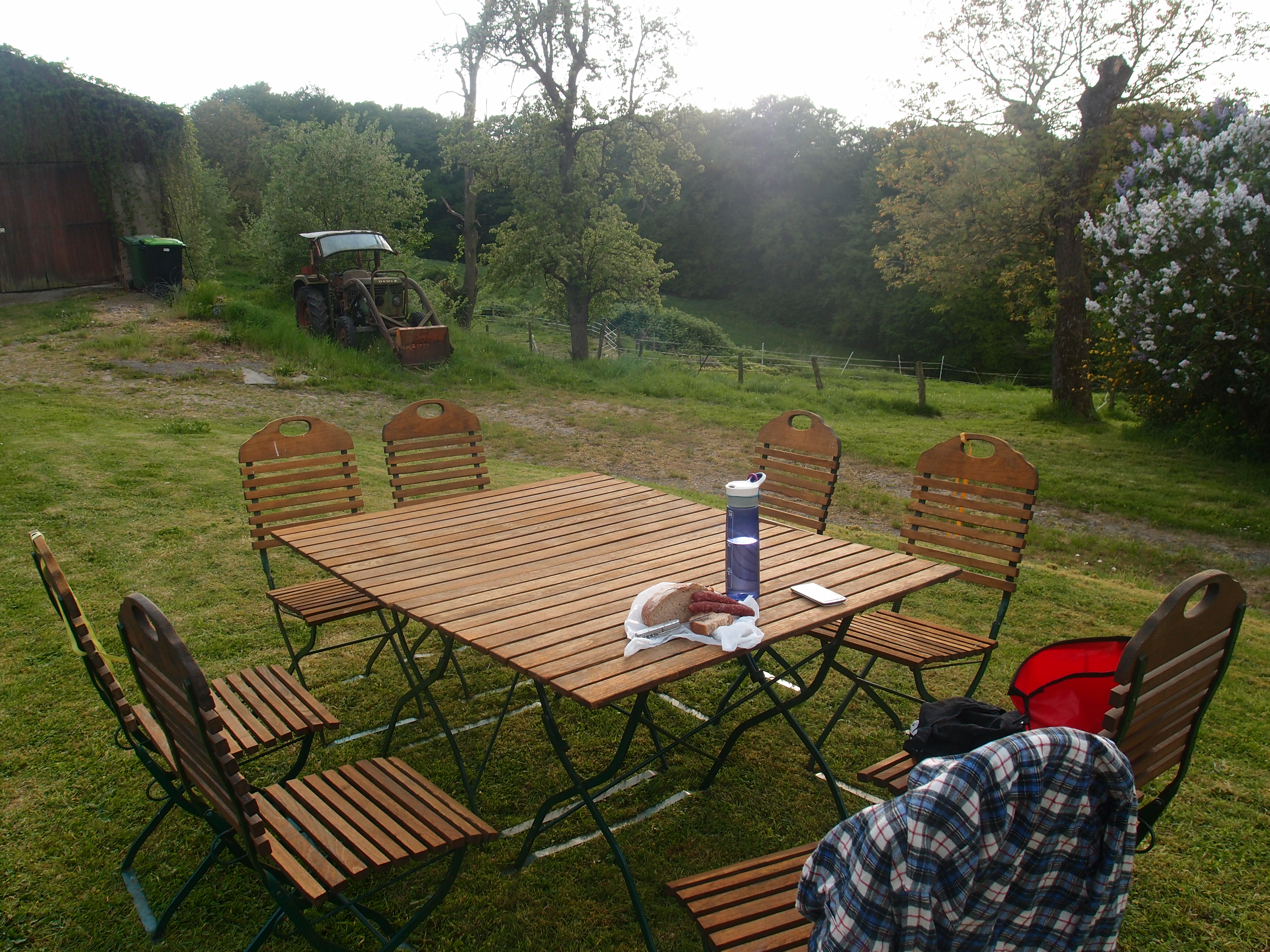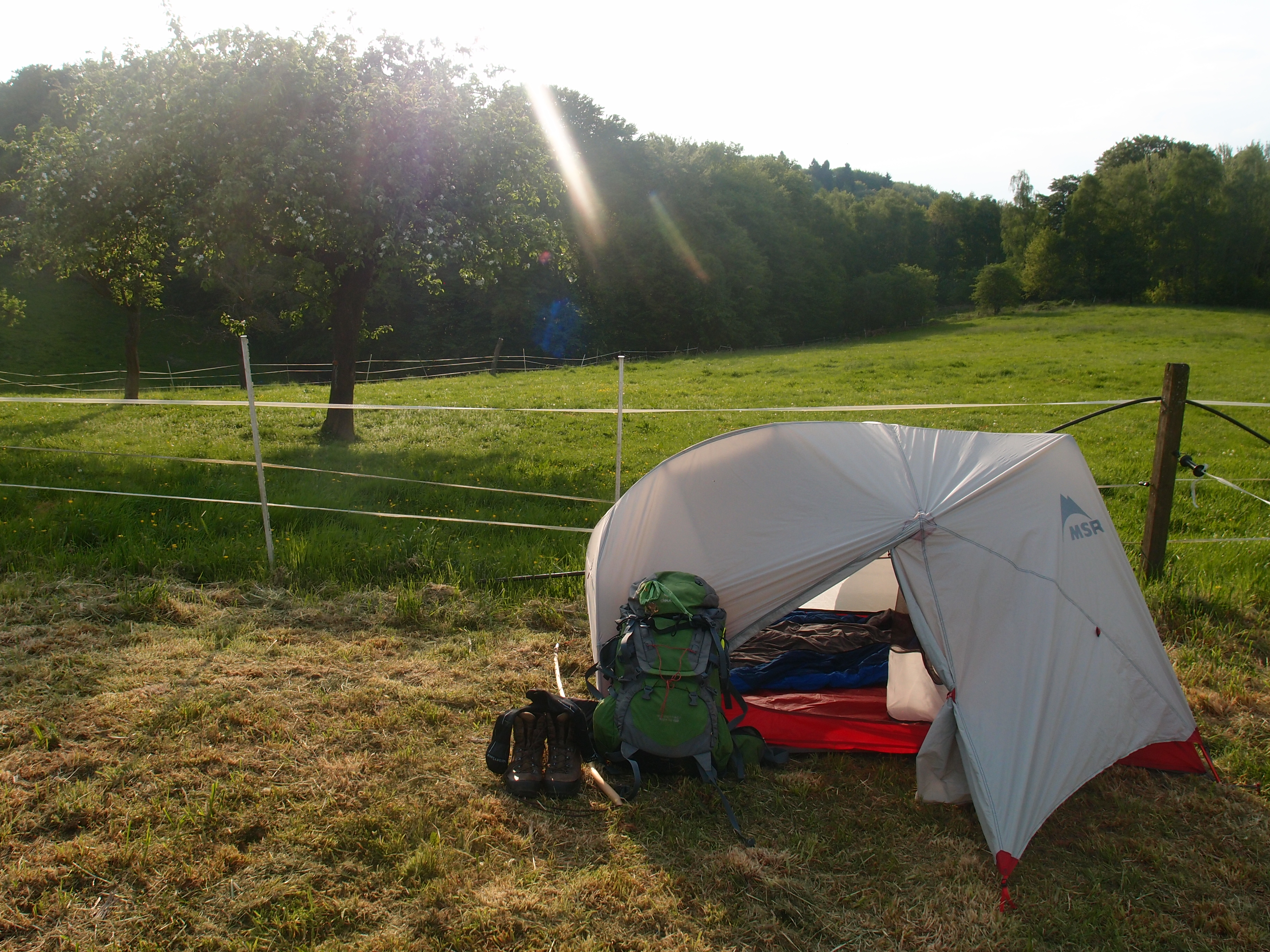 Die Wege danach führen wieder durch schöne saftiggrüne Wiesen und auf Pfaden durch Wälder. Nachdem ich aus den Bäumen durch ein Feld zu einem Hof komme, und es schon fast 20 Uhr ist, beschließe ich, hier nachzufragen. Der Besitzer ist einverstanden und ich stelle, dankbar nicht mehr Weiterlaufen zu müssen,  mein Zelt auf eine Wiese hinter die Scheune vom Scheurenhof.