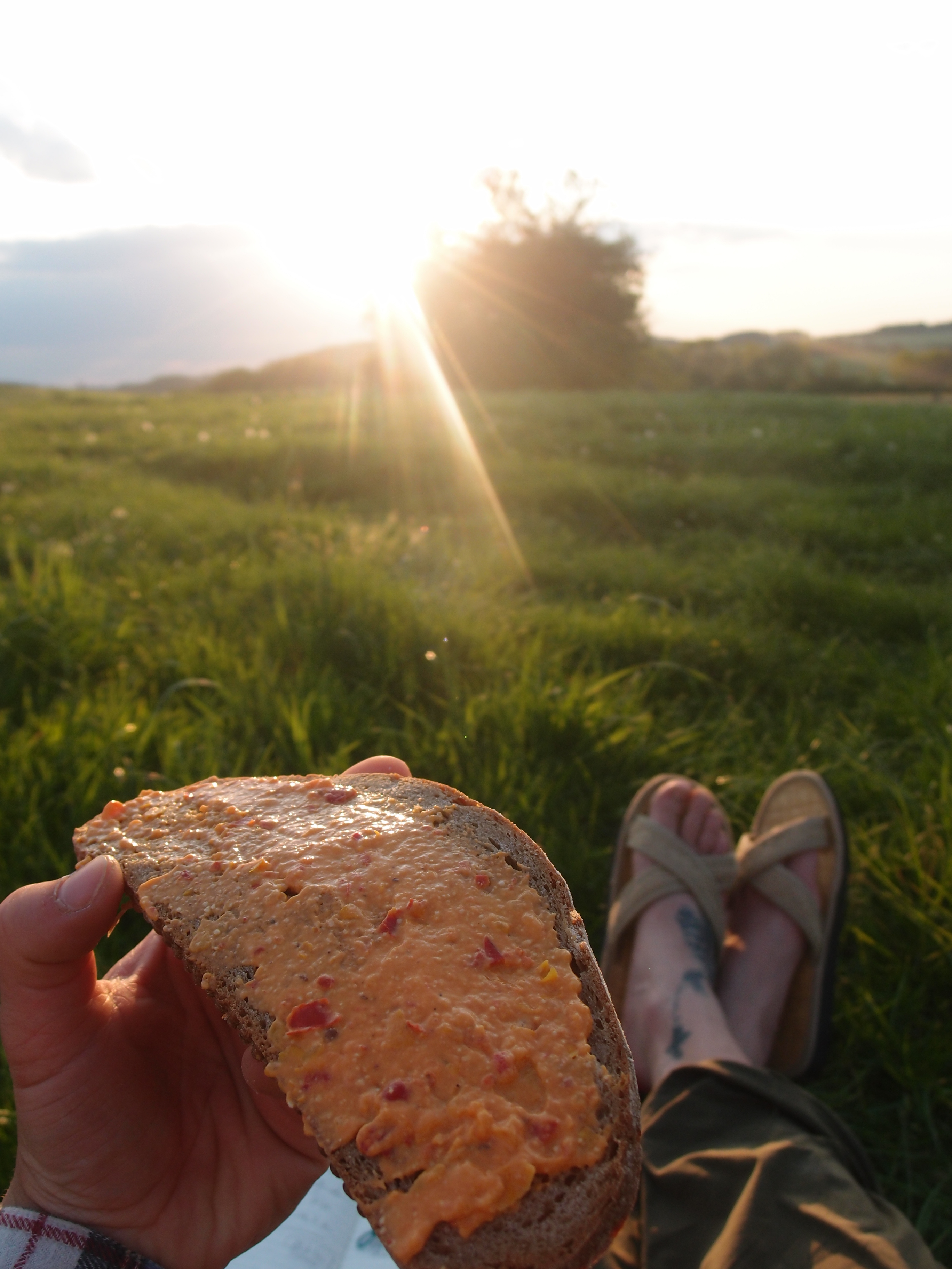 Zum Kochen bin ich zu faul, daher kommt das Pesto aufs Brot, Käse und Tomaten von Barbara dazu, feines Abendmahl, mein Zelt ruft! Der romantische Sonnenuntergang hinterm Feld lässt auch die Anstiege wieder vergessen,  nach kurzem Schreckmoment – ich glaube eins der Lämmer ist ausgebückst und wie wild an meinem Zelt vorbei gerannt – schlaf ich aber ruhig,  meine Stangenkonstruktion hält erneut.