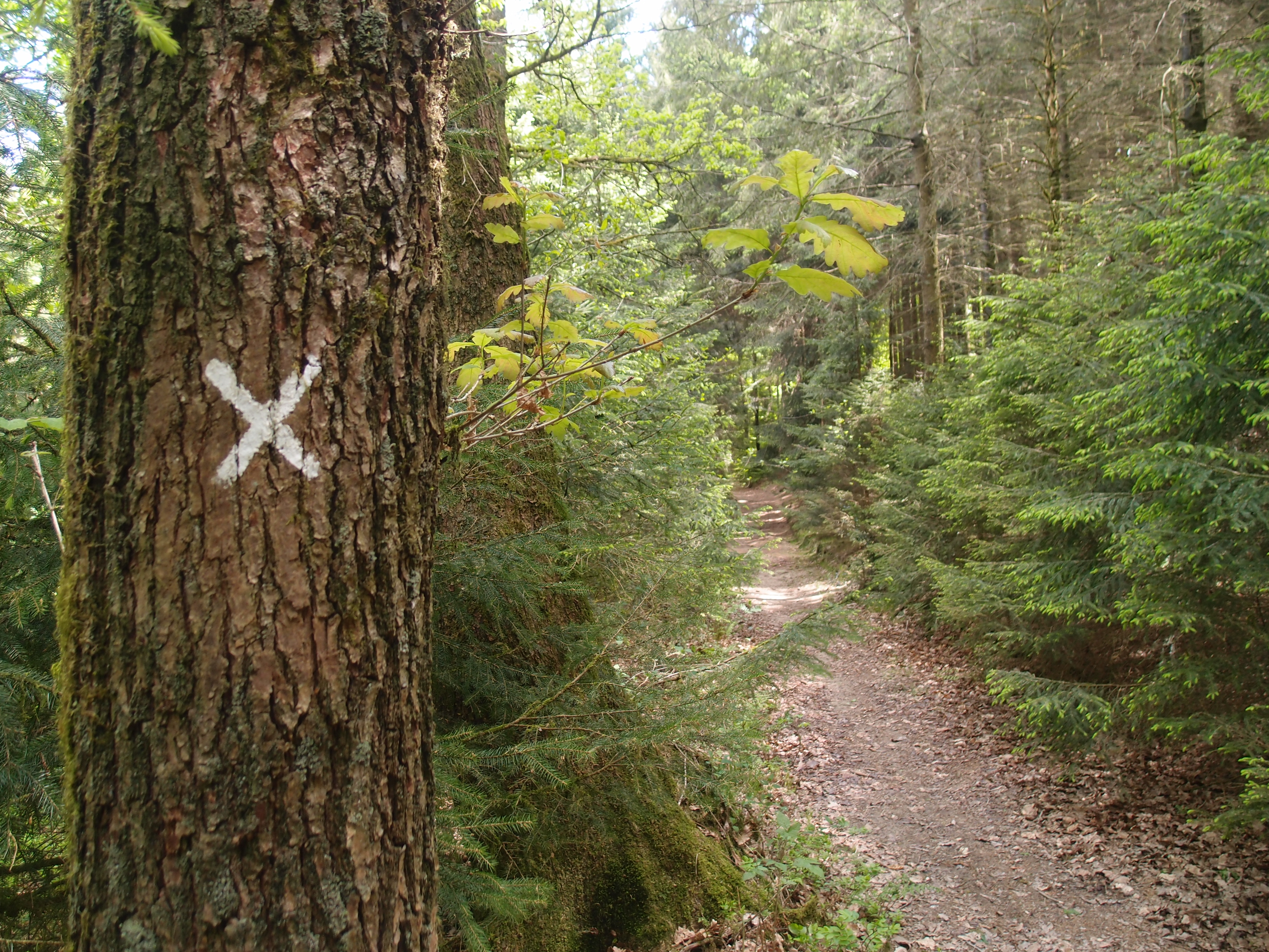Zunächst find ich zwar den X28 und den A3 wie geplant,  nur um sie 3 km später wieder zu verlieren (nach einem anstrengenden 1,5 km Marsch aufwärts), und kurz darauf wieder zu finden. Soweit so gut. Es geht weiter den Berg hoch bis einfach irgendwann kein Zeichen mehr zu sehen ist, ehrlich. Es  geht nur links oder rechts. Erst laufe ich nach rechts und schaue ob ich weiter vorne wieder ein Zeichen finde. Niente. Ich kehre um und gehe ein Stück zurück, schaue nochmal auf die Bäume kurz vor der Kreuzung. Niente. Ich schaue auf meine Karte, versuche zu schätzen,  an welchem Punkt ich bin, stelle fest: Nichts genaues weiß man nicht, aber die Richtung ist Südost. Logische Konsequenz: Ich biege links ab, rechts waren ja keine Zeichen, geradeaus geht’s nicht, wo ich herkam war auch nix hilfreiches auszumachen.