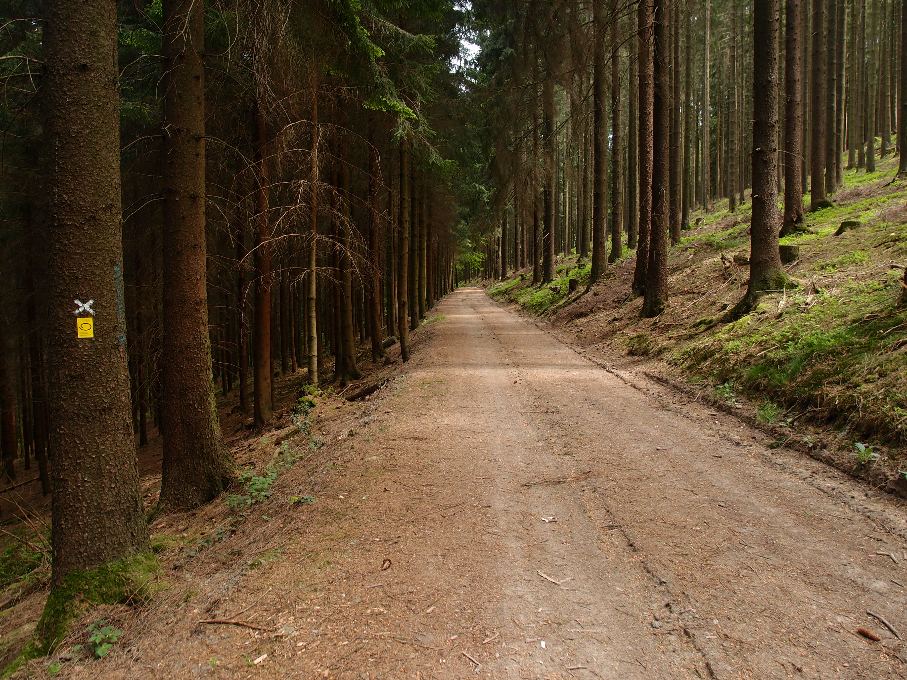 Ja, nee. Hoffnung in aller ehren, die Hoffnung stirbt zu letzt und so, aber einfach Nee. Hinter den großen Bäumen finden sich kleine Bäume, hinter denen wieder große Bäume kommen. Ich schlage mich gefühlt ne halbe Stunde durch zumeist Fichten, kreuz und quer, immer südöstlich sofern die zum Teil zu dicht stehenden Baume es zulassen. 2:2 offiziell, aber innerlich habe ich das Spiel gegen den Verwanderweg schon haushoch verloren. Ich bin jetzt ziemlich aggressiv, fluche laut, zwischendurch texte ich verzweifelt irgendwelche Lieder um („Hannalein ging allein, in den großen Wald hinein, da verirrt, sich das Kind, will hier raus geschwind“, nur eins von vielen…). Als ich einen normalen Weg erspähe und erreiche bin ich tatsächlich so dreist, auszurufen: „Ja man, und warum? Weil ich’s kann!“