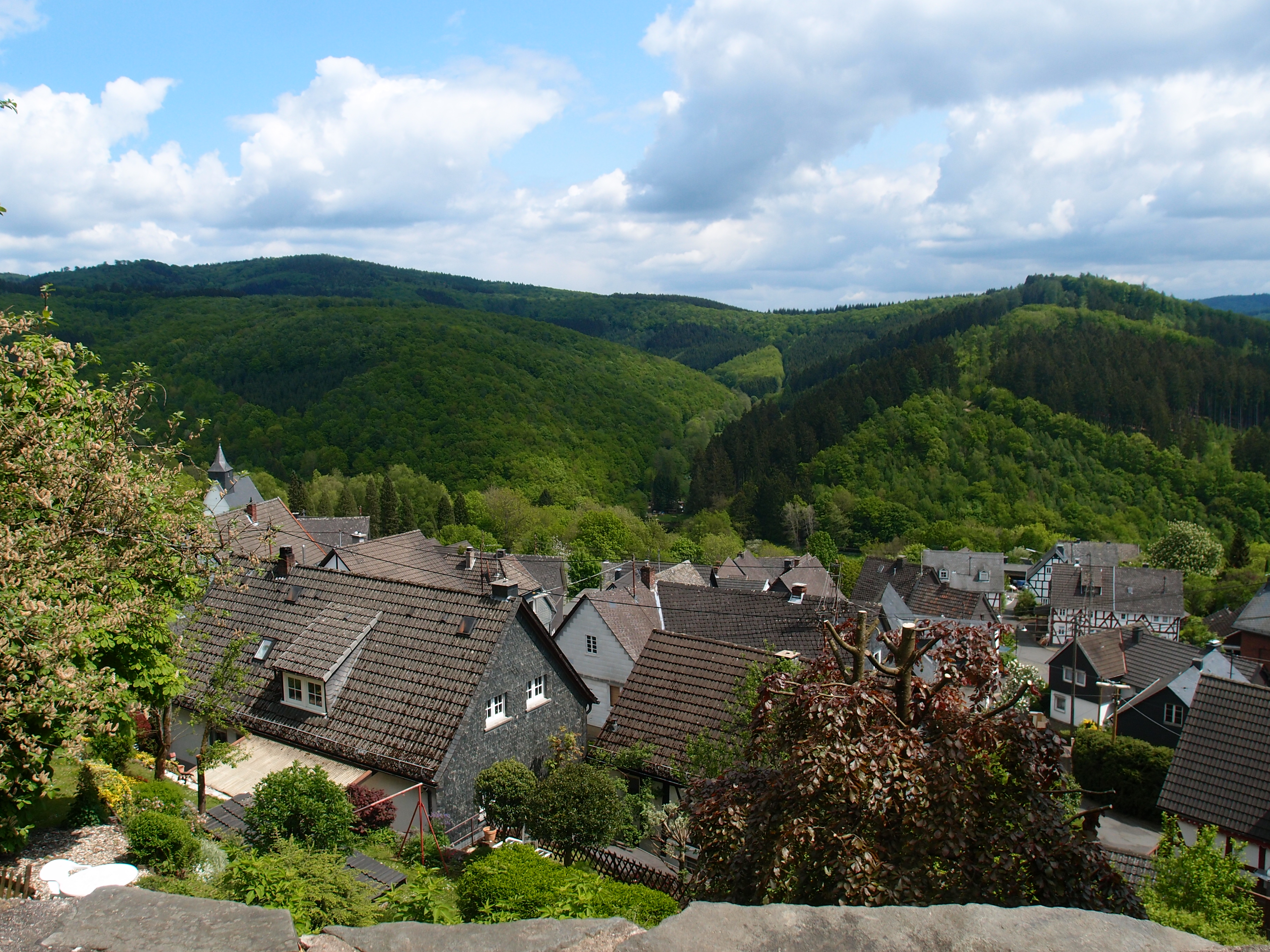 Von den beiden hatte ich mich so gegen halb zehn getrennt – nur schwer, es war doch einfach zu schön, zu gemütlich und so nett bei den beiden! Es war ein herzlicher Abschied und das, sowie das gute Frühstück und der leckere Kaffee,  trieb mich den steilen Berg zur Schloss Burg hinauf. Puh, nach 20 Minuten war ich durchgeschwitzt,  traumhaftes Sunshine-Blue Sky-Wetter begleitete mich. Oben angelangt musste ich ein paar Fehlversuche hinnehmen, aber irgendwann fand ich dann doch den Wanderweg, den ich gesucht hatte.