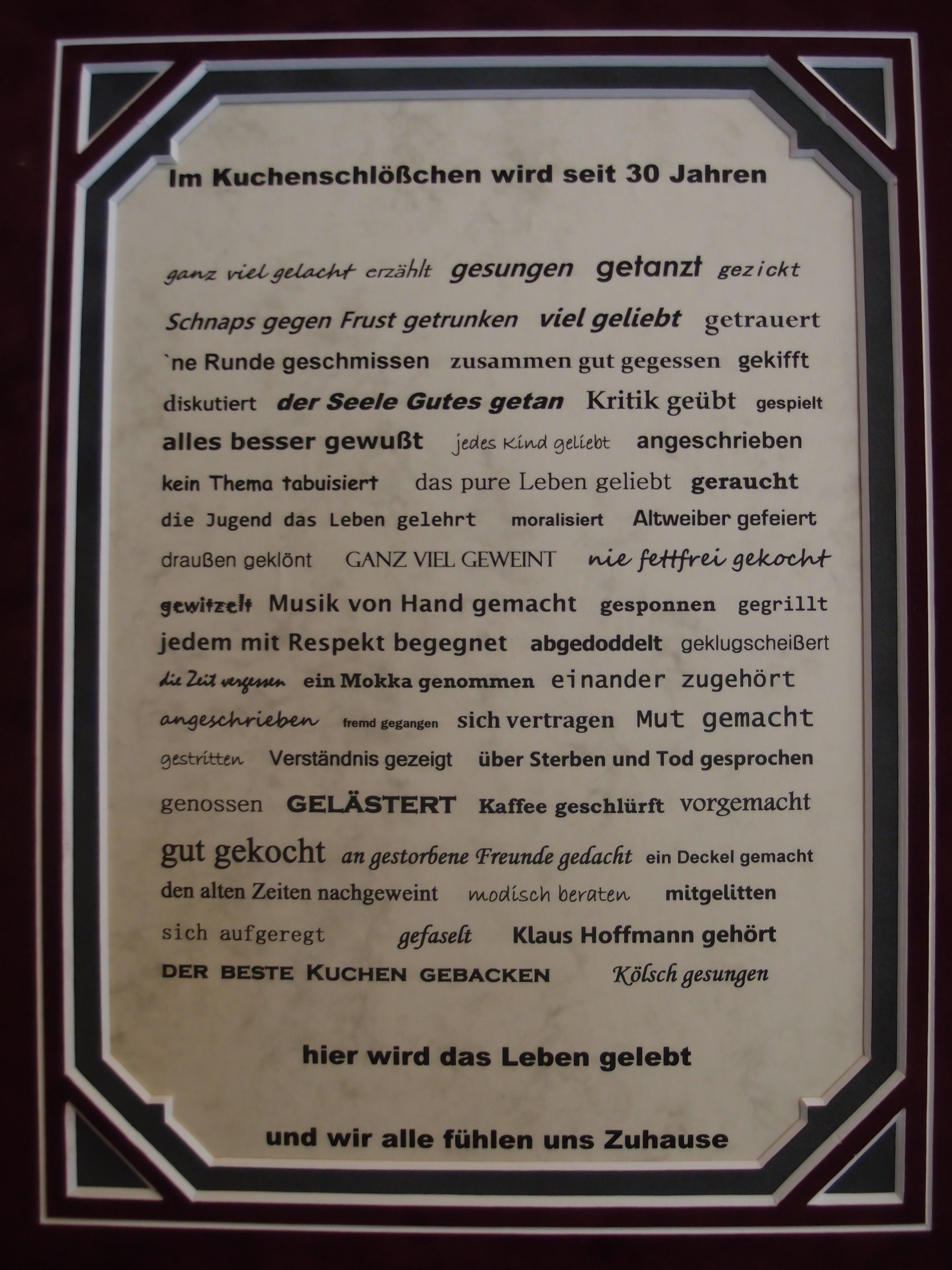 Steht auf einem der zig tollen, lustigen, bedeutungsvoll- bis bedeutungslosen Schilder, in einem der schönsten Cafés, die ich je besucht habe! Und das sage ich nicht nur, weil das Kuchenschlößchen meine unerwartete Bleibe für heute Nacht werden sollte. 😀 Stellt euch mal vor, ich würde keinen Kuchen essen! Oder gar keinen Kaffee trinken! Ich wäre nie hier gelandet und das wäre ja wohl sehr sehr seeeeeehr schade gewesen… Also Leute, esst mehr Kuchen! 😀