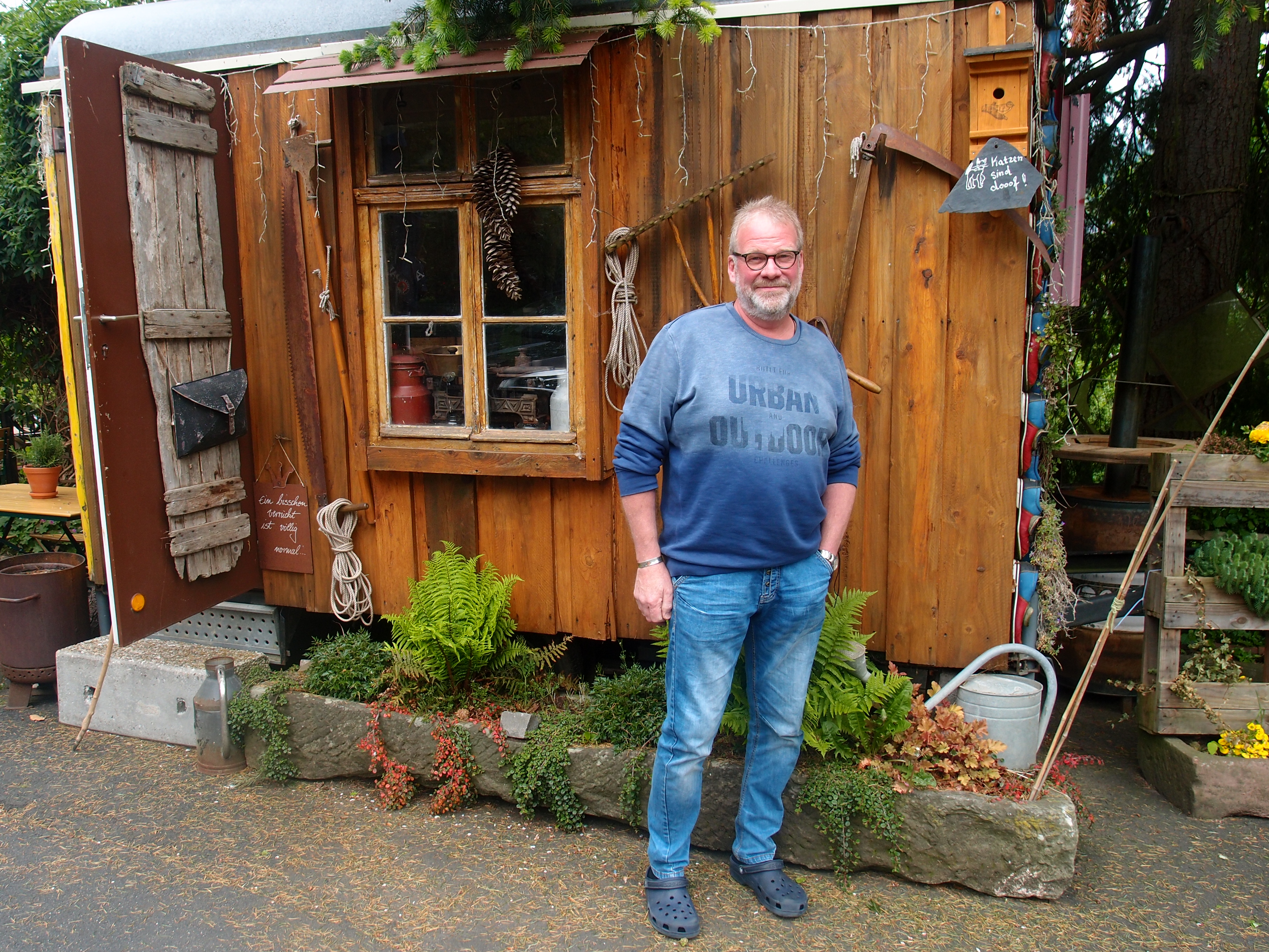 Gerhard, der detailverliebt sowohl Bauwagen als auch Kuchenschlösschen hergerichtet hat