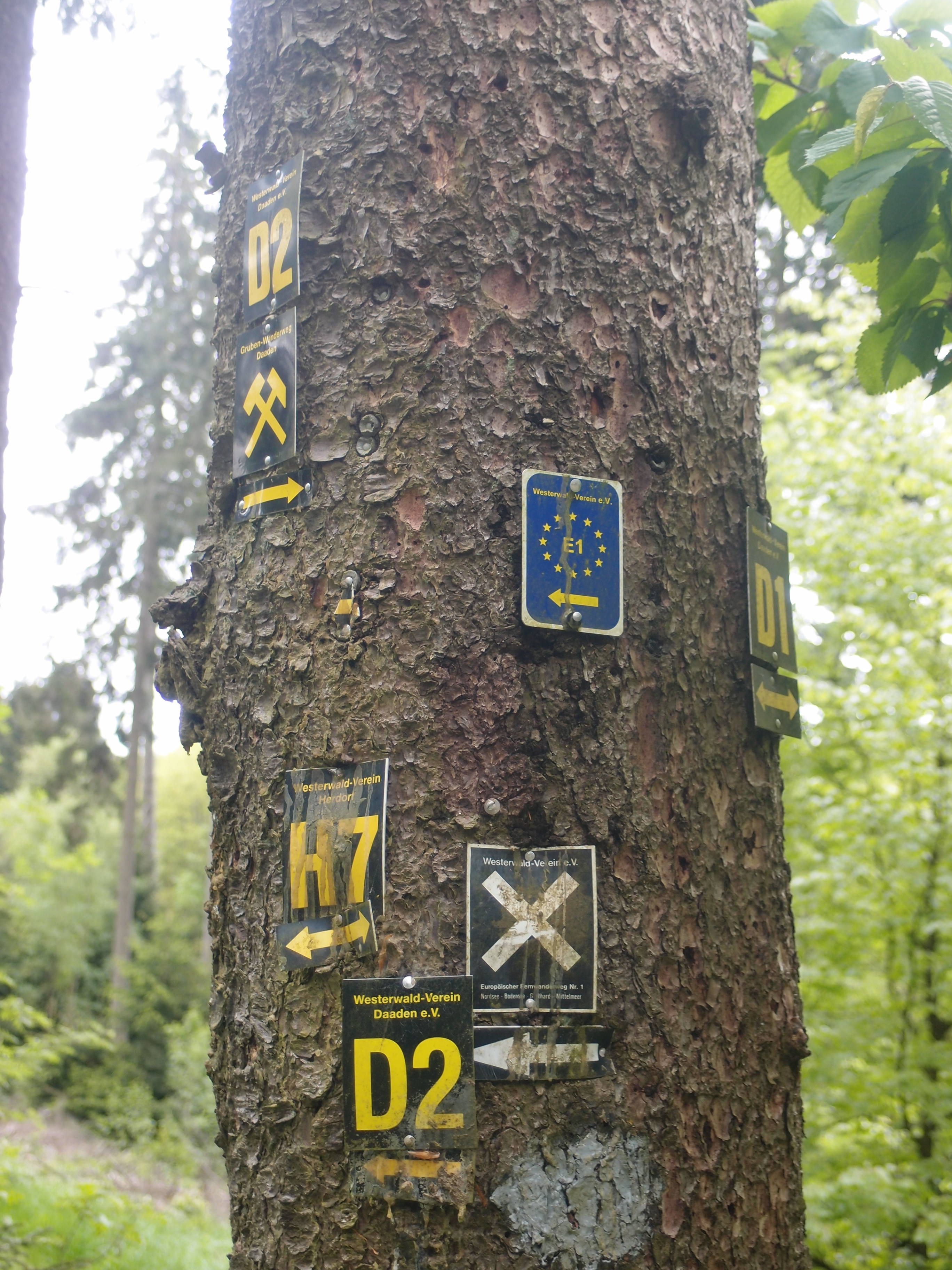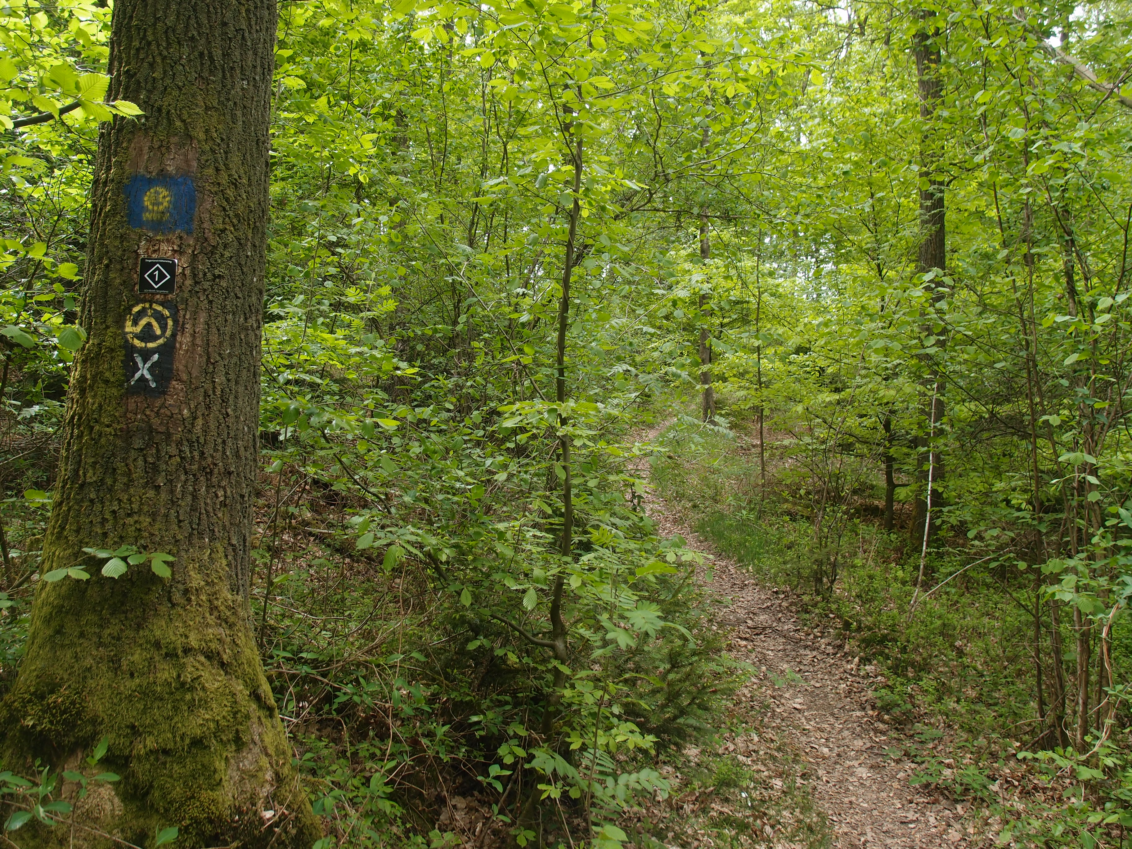 Nach Brot und Käse und längeren Krauleinheiten für eine Hunde-Omi, mach ich mich weiter, es ist doch recht frisch, um lange Pausen zu machen. Der Druidensteig bzw. Europäische Fernwanderweg E1, dem ich folge und der sich dem bestehenden Wegenetz bedient, ist wirklich sehr schön in dieser Grenzgegend zwischen NRW und Rheinland Pfalz. Und super gekennzeichnet! Wenn ich da an den E3 im letzten Jahr denke, mei, das war was, Kraut und Rüben. Aber hier erreiche ich nach wunderschönen Waldpfaden, die immer wieder auch mal Blicke über die Baumkuppen hinweg erlauben, ohne ein einziges Mal auf die Karte schauen zu müssen nach etwa 12 Kilometern problemlos Herdorf. Da ich unterwegs den zuständigen Wanderwegewart bei der Instandhaltung der Wege treffe, kann ich dem sogar persönlich danken.