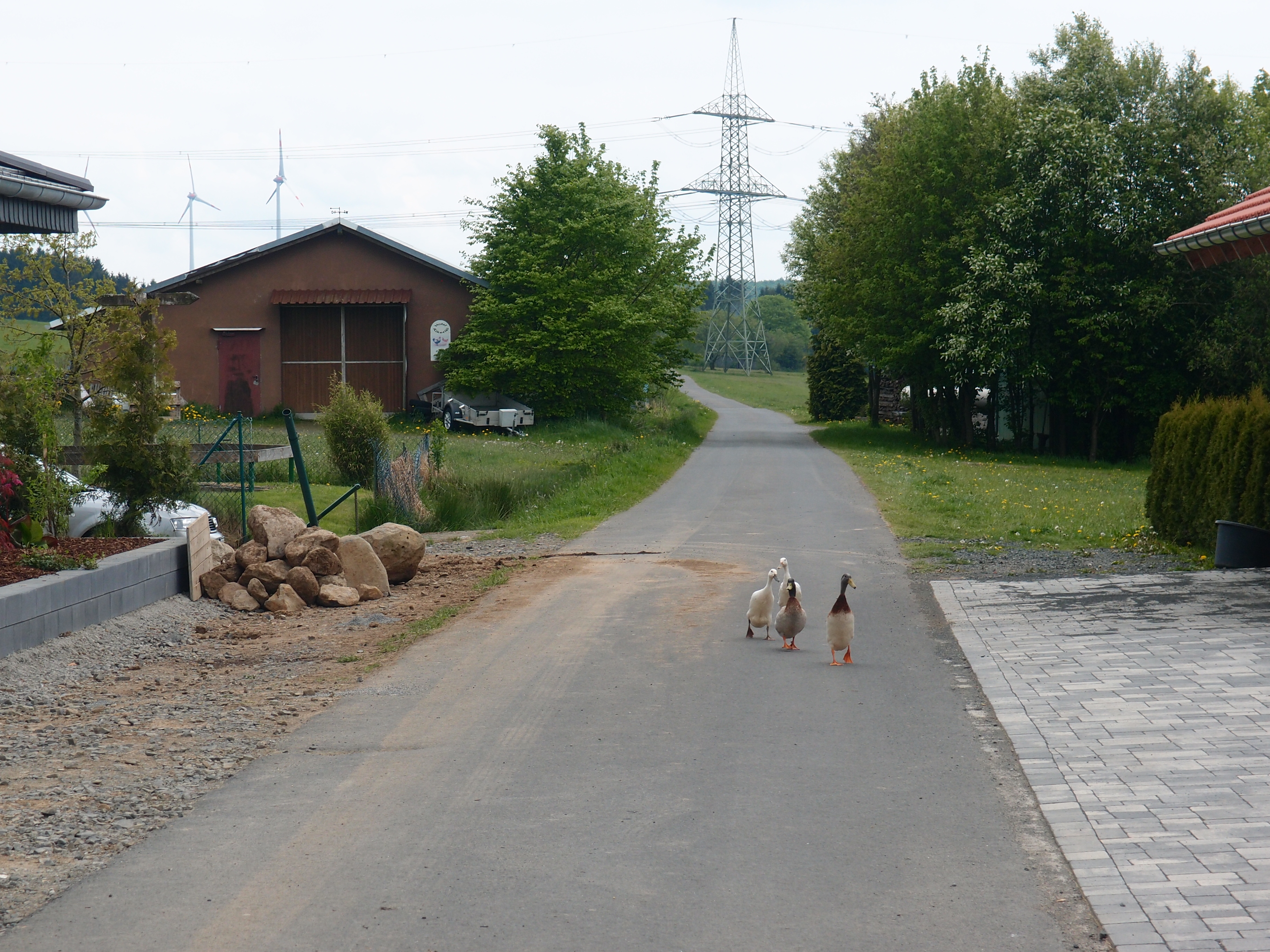 Ganz schön windig hier, daher weiter. Man merkt schon, sobald der fast immer wehende Wind mal aufhört, dass die Temperaturen hochklettern, aber die graue Stimmung bleibt noch. Ich sehne mich nach nem Kaffee! Der wird mir „erst“ bei 14 Kilometern in einer Bäckerei gewehrt. Gegen halb zwei raff ich mich zum Weitergehen auf – das Koffein scheint zu wirken, vielleicht aber auch die Wärme, die die nun immer mal wieder durchbrechende Sonne bringt. Wahrscheinlich beides. Zumindest läuft es sich jetzt beschwingt, ich freu mich über Federvieh auf der Straße, über das Herumschwingen meines Wanderstocks und das Wasser, das ich bald erreiche.