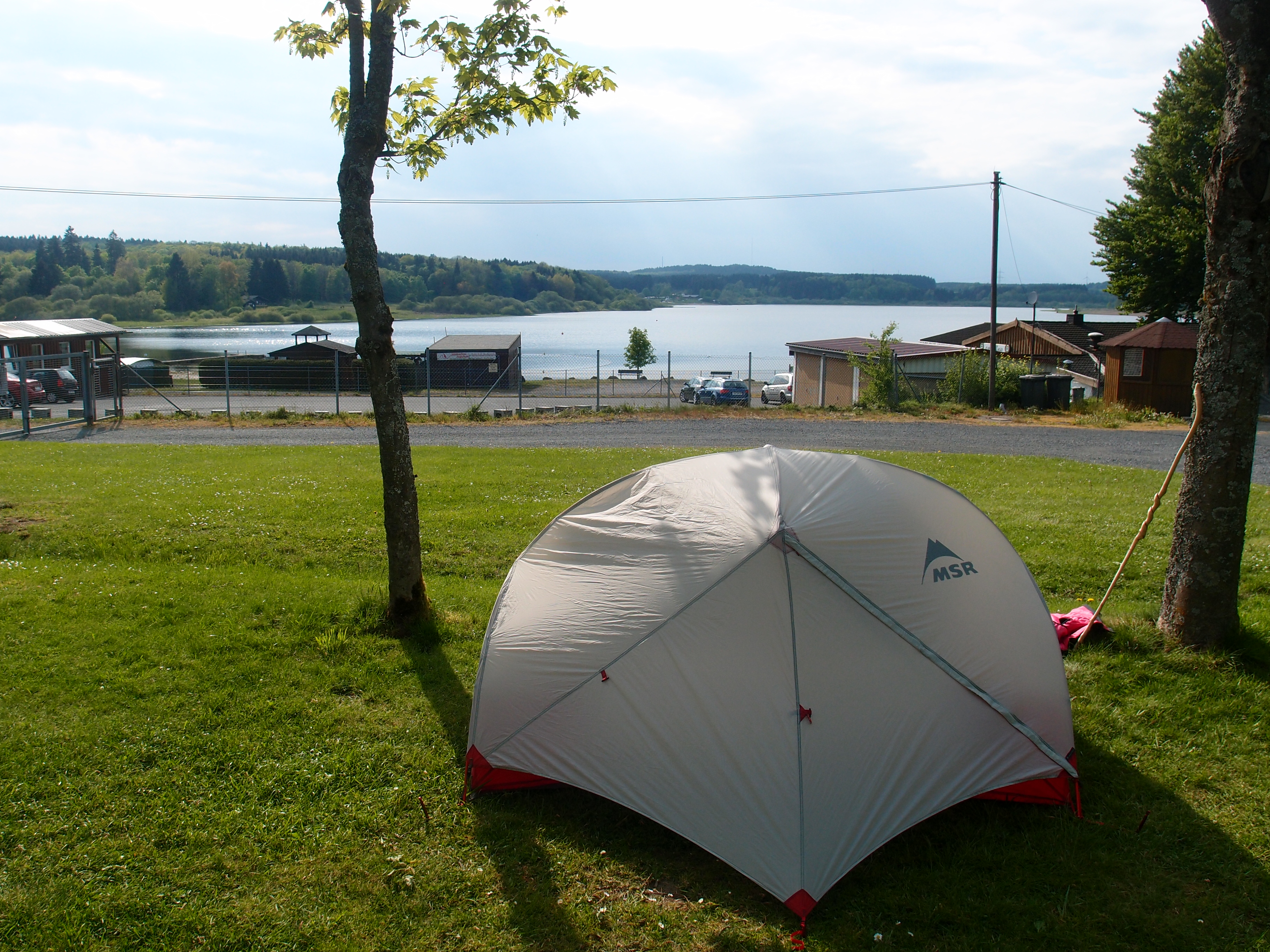 Ok, das hätte ich auch nich erkennen können 🙂 Super! Das Zelt wird auf einen strategisch günstigen Platz zwischen zwei Bäumchen gesetzt – nicht direkt am Zauntor/der Straße, nicht weit weg von den modernen, sauberen Sanitärräumen, etwas erhöht mit tollem Ausblick über die Krombachtalsperre – und sich davor hingesetzt und erstmal nichts gemacht. Ich lass mir die Sonne ins Gesicht scheinen und freu mich einfach mal, nicht zu laufen, nicht irgendwas aufzubauen, nichts zu schreiben und nichts zu waschen. Herrlich.