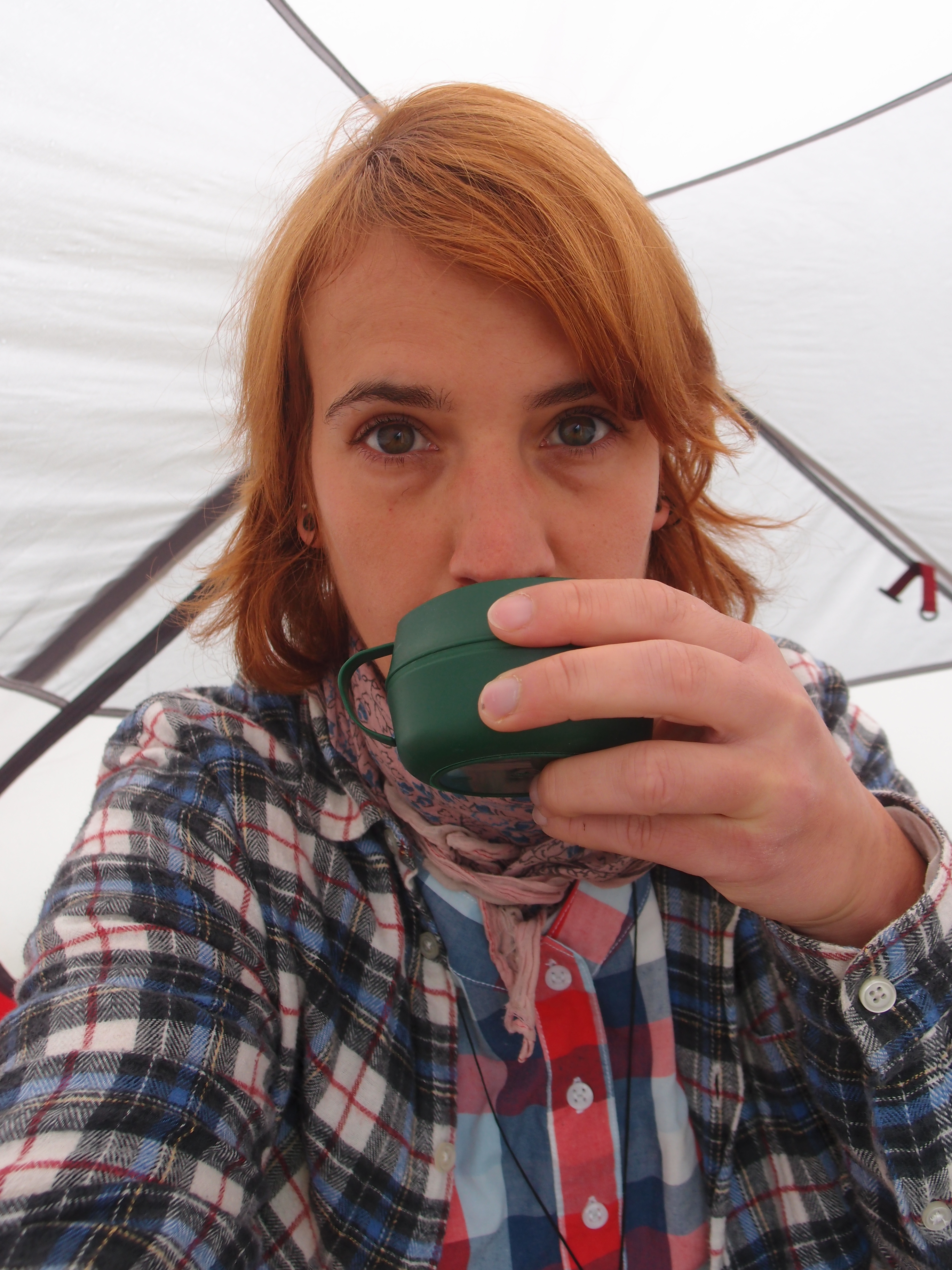 Noch dick eingepackt: Kaffee trinkem im Zelt und warten, bis der schlimmste Regen vorbei ist