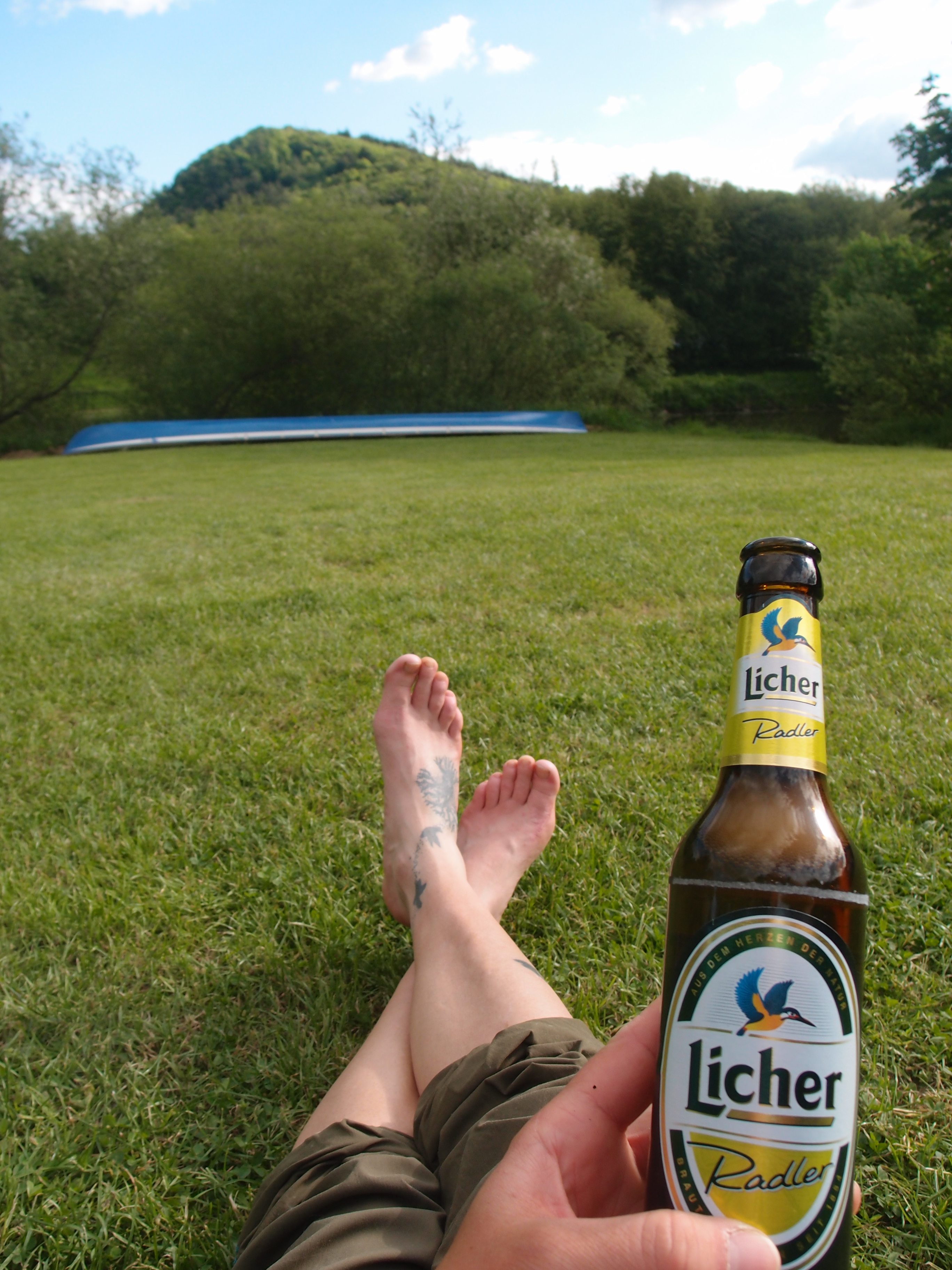 Ankommen, Schuhe ausziehen, Radler trinken - der Zeltaufbau muss warten