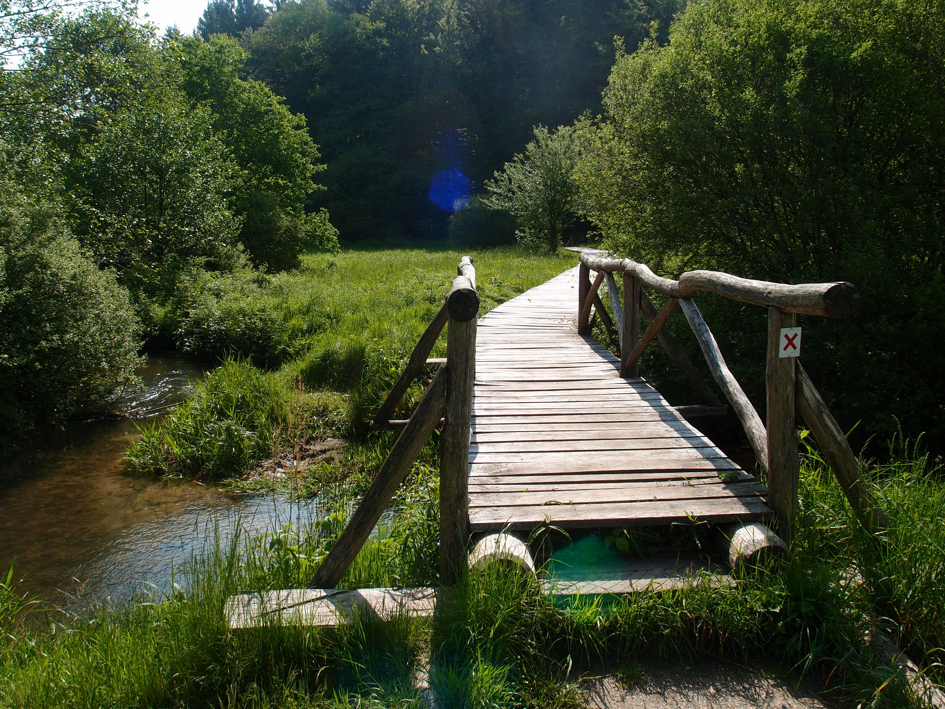 Über ein sumpfiges Wiesental zwischen zwei Wäldern und den Fluss führt ein Holzsteg
