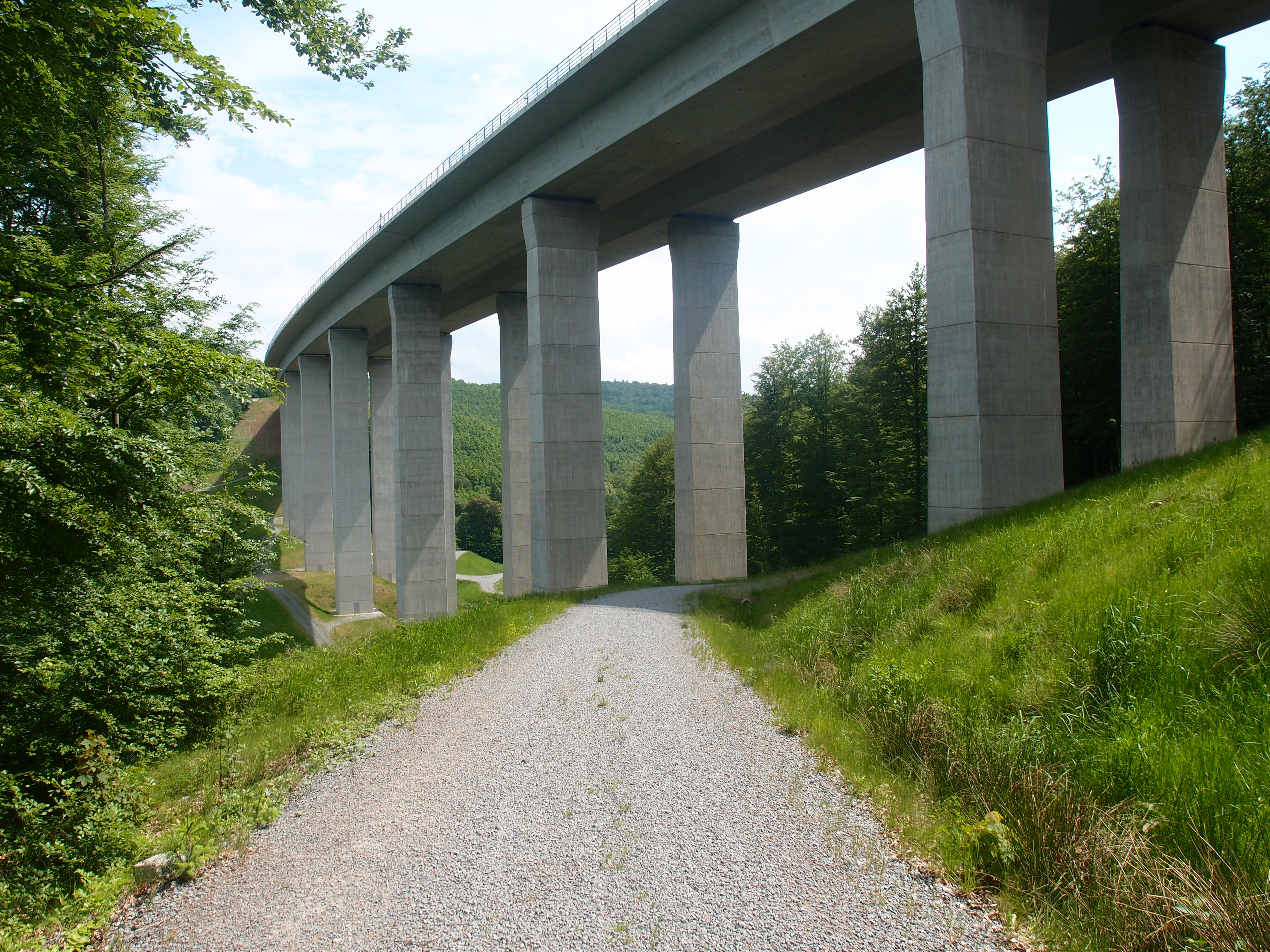 …dem Zeitalter der Moderne: Der Wanderweg führt kurz danach unter der Autobahnbrücke hindurch