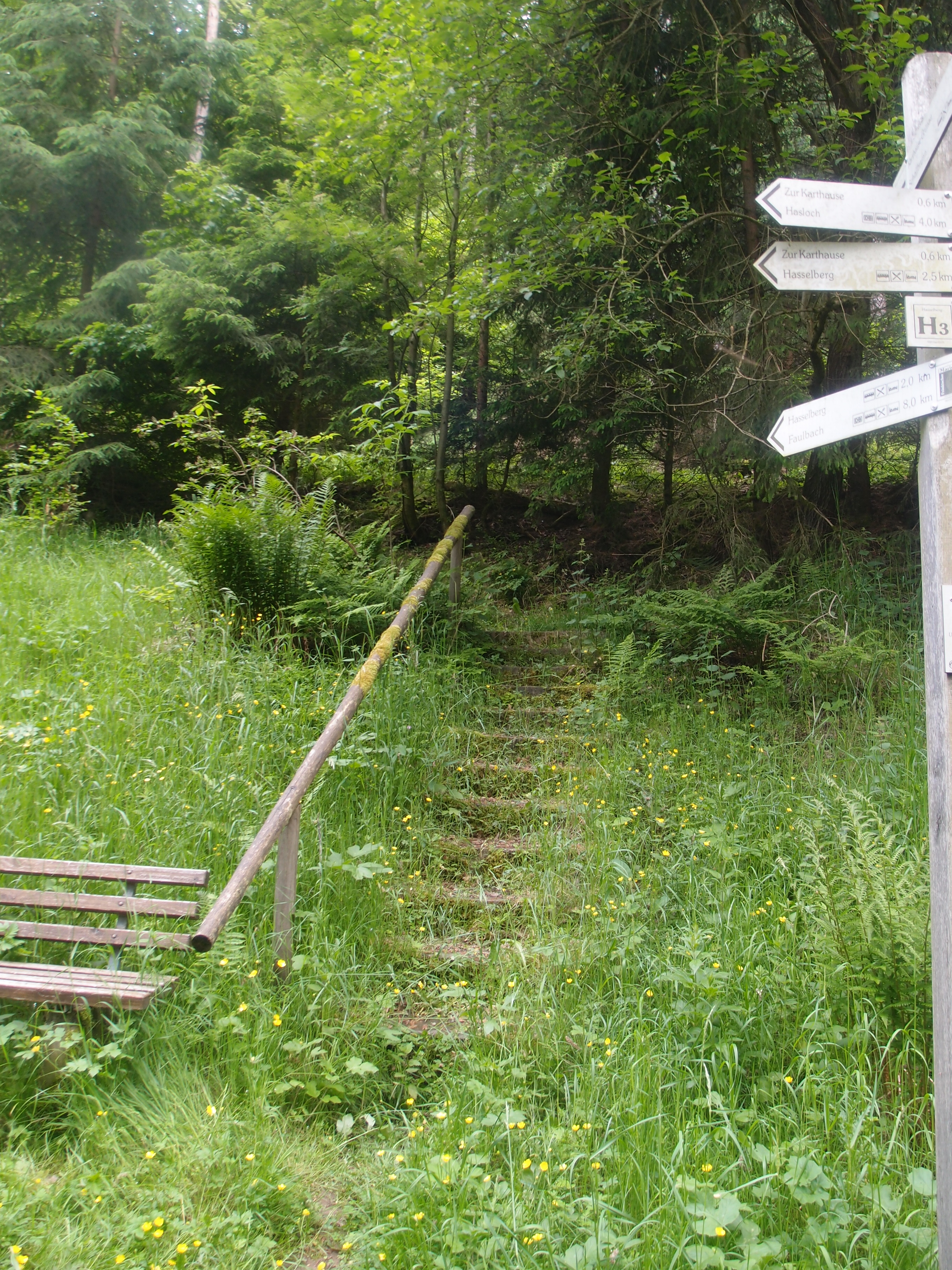 Ich habe euch von dem Schild erzählt, auf dem ich das este Mal „Hasselberg“ lesen konnte. Bis dahin war ich am Samstag schon 27 Kilometer gelaufen, hatte einen anstrengenden, steilen Anstieg auf den Bayerskopf (523 m Höhe) hinter mir und mehrere lange Anstiege auf Kiesstraßen unter den Wandersohlen. Als ich dieses kleine Holzschild am Anfang von einem schmalen Pfad entdeckte, lachte ich auf: Kurz vorher hatte man mir gesagt, der kleine Schleichpfad von der Kartause in Grünau hoch auf den Hasselberg, den würde es nicht mehr so geben, der würde nicht mehr benutzt werden, der wäre nicht mehr gut zu begehen, wenn überhaupt, und wer weiß, ob ich den so finden würde…